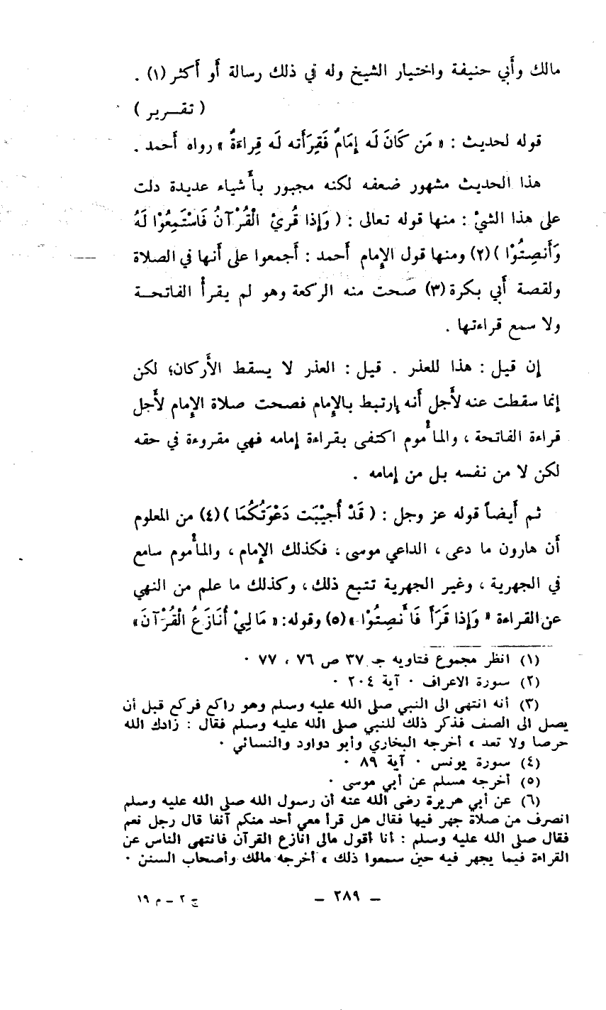 ثم أيضاً قوله عز وجل: {قد أُجيبت دعوتكما} (¬4) من المعلوم أن هارون ما دعى، الداعي موسى، فكذلك الإمام، والمأموم سامع في الجهرية، وغير الجهرية تتبع ذلك، وكذلك ما علم من النهي عن القراءة"وإذا قرأ فأنصتوا" (¬5) وقوله: " ما لي أنازع القرآن "