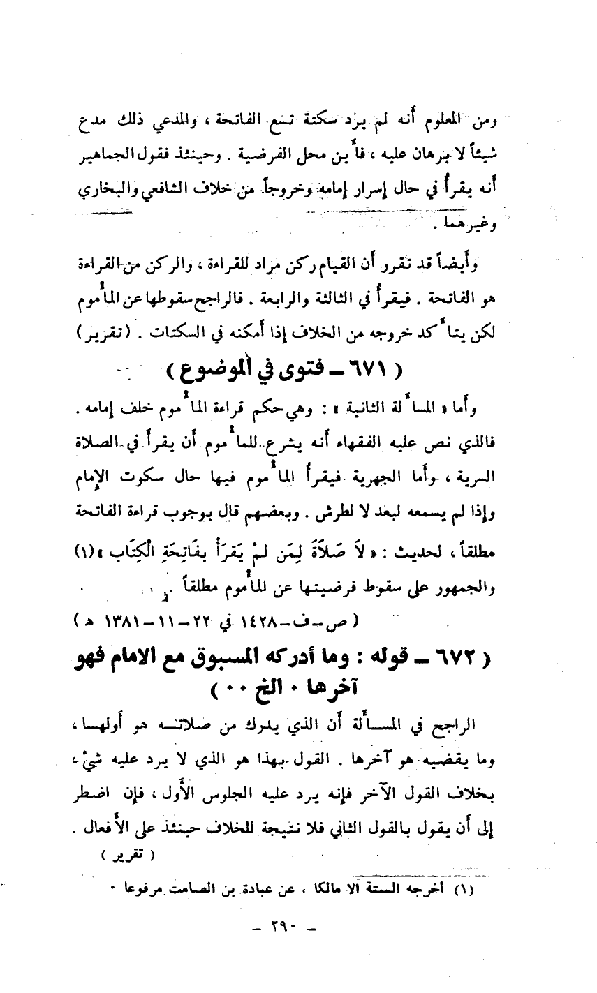 وأما " المسألة الثانية " وهي حكم قراءة المأموم خلف إمامه فالذي نص عليه الفقهاء أنه يشرع للمأموم أن يقرأ في الصلاة السرية، وأما الجهرية فيقرأ المأموم فيها حال سكوت الإمام وإذا لم يسمعه لبعد لا لطرش. وبعضهم قال بوجود قراءة الفاتحة مطلقاً، لحديث: " لا صلاة لمن لم يقرأ بفاتحة الكتاب" (¬1) والجمهور على سقوط فرضيتها عن المأموم مطلقاً.