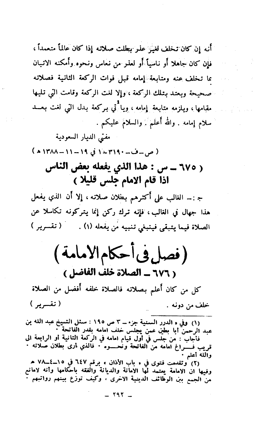 (¬1) وفي " الدرر السنية جزء ـ 3ص195: سئل الشيخ عبد الله بن عبد الرحمن أبا بطين عمن يجلس خلف امامه بقدر الفاتحة. فأجاب: من جلس في أول قيام امامه في الركعة الثانية أو الرابعة إلى قريب فراغ امامه من الفاتحة ونحوه. فالذي أرى بطلان صلاته والله أعلم.