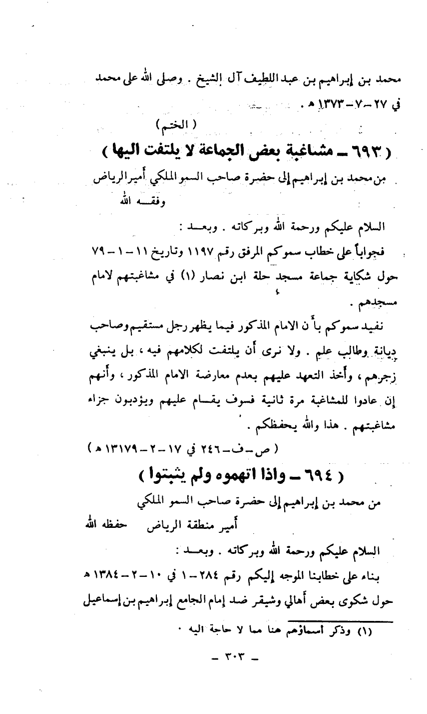 فجواباً على خطاب سموكم المرفق رقم 1197 وتاريخ 11/1/79 حول شكاية جماعة مسجد حلة ابن نصار (¬1) في مشاغبتهم لامام مسجدهم.