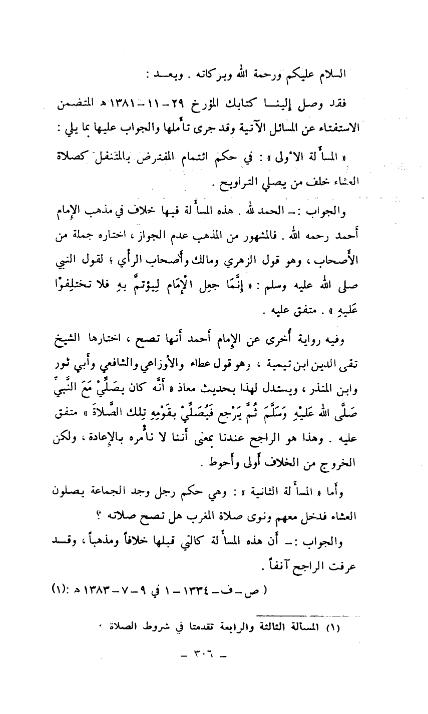 فقدوصل إلينا كتابك المؤرخ 29/11/1381هـ المتضمن الاستفتاء عن المسائل الآتية وقد جرى تأملها والجواب عليها بما يلي: