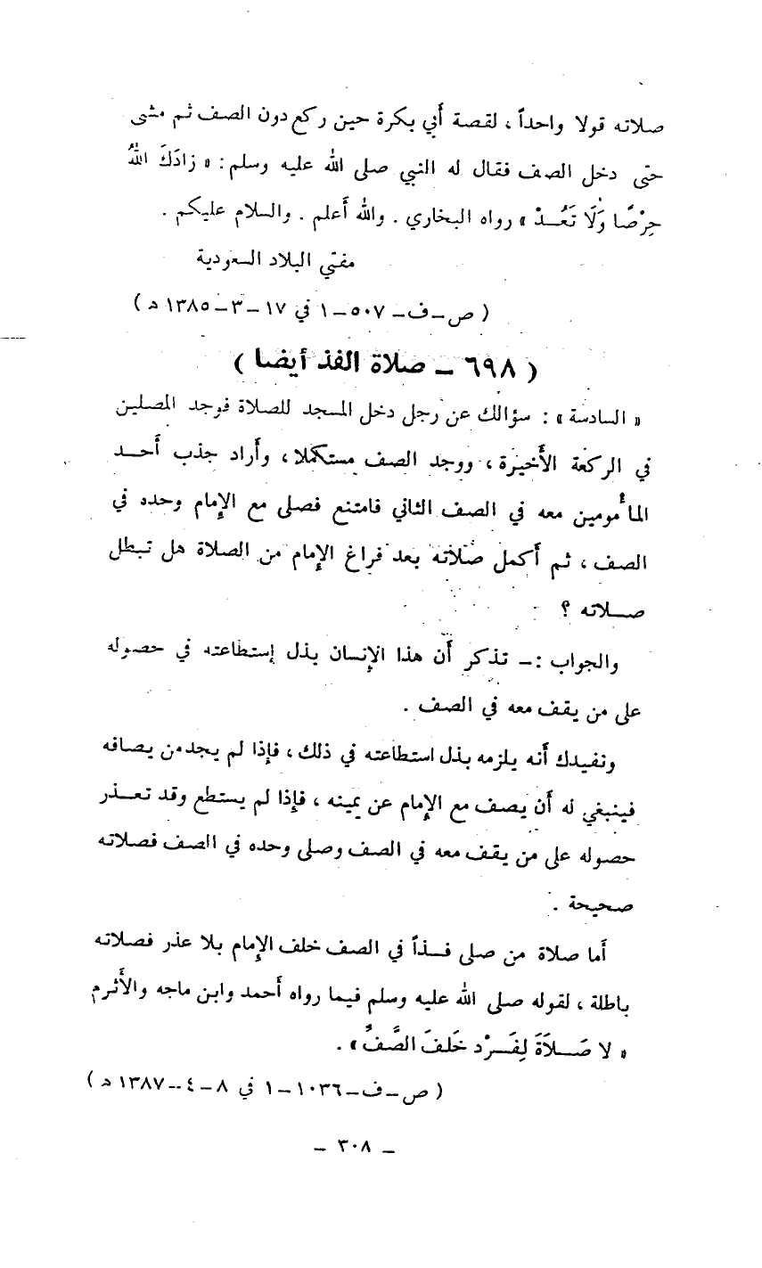 "السادسة" سؤالك عن رجل دخل المسجد للصلاة فوجد المصلين في الركعة الأخيرة، ووجد الصف مستكملاً وأراد جذب أحد المأمومين معه في الصف الثاني فامتنع فصلى مع الإمام وحده في الصف، ثم أكمل صلاته بد فراغ الإمام من الصلاة هل تبطل صلاته؟