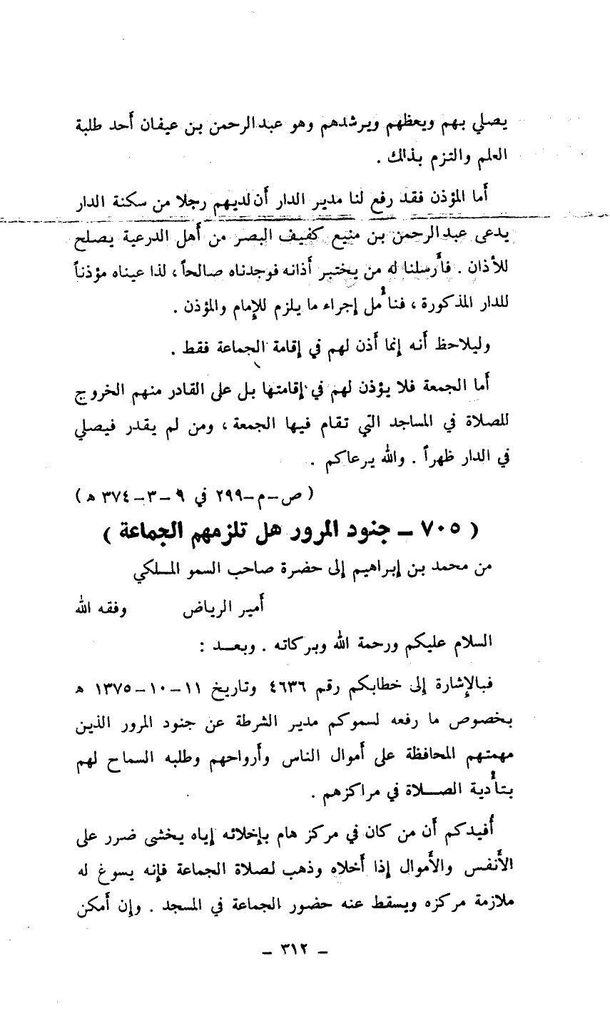 فبالإشارة إلى خطابكم رقم 4636 وتاريخ 11/10/1375 هـ بخصوص ما رفعه سلموكم مدير الشرطة عن جنود المرور الذين مهمتهم المحافظة على أموال الناس وأرواحهم وطلبه السماح لهم بتأدية الصلاة في مراكزهم.