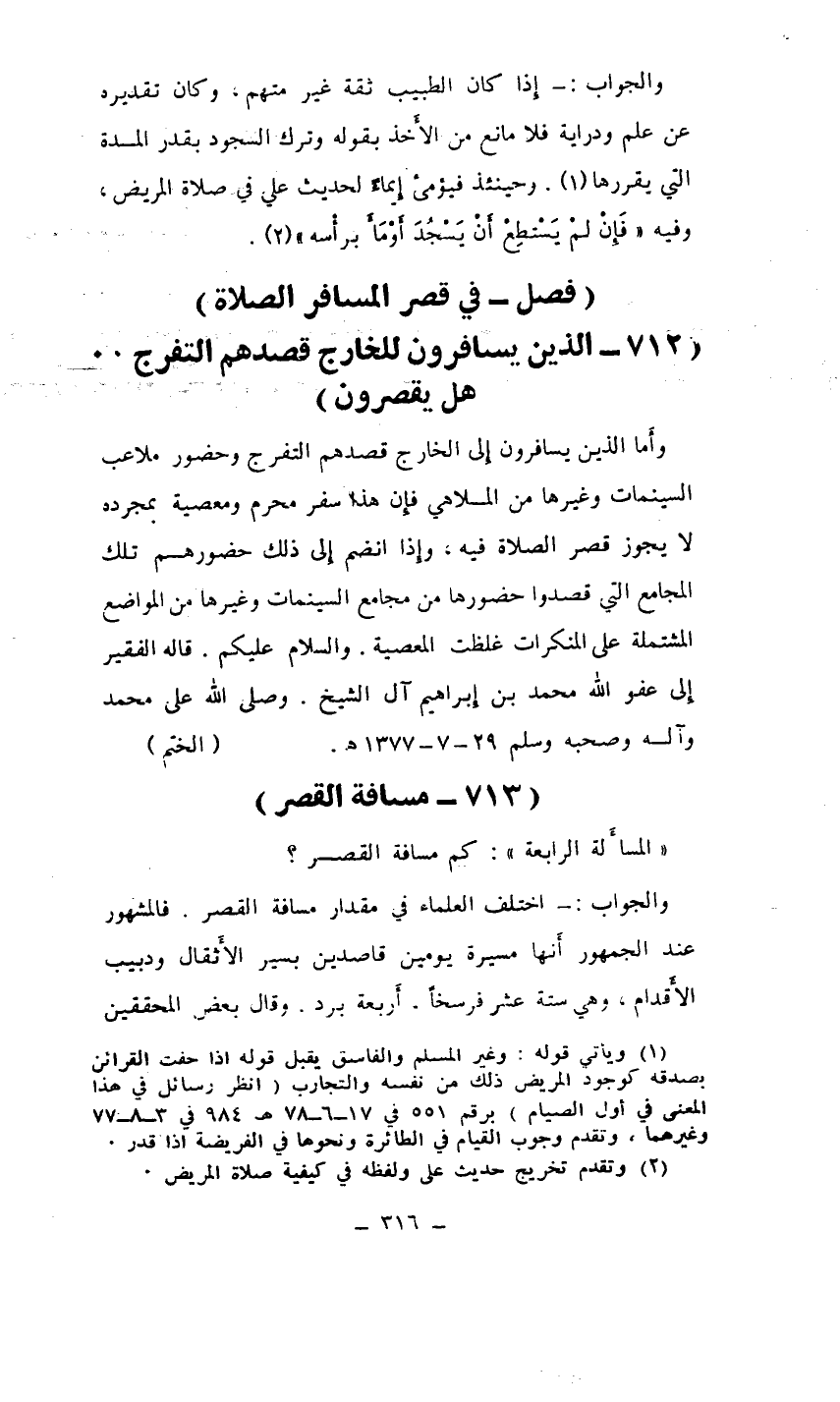 وأما الذين يسافرون إلى الخارج قصدهم التفرج وحضور ملاعب السينمات وغيرها من الملاهي فإن هذا سفر محرم ومعصية بمجرده لا يجوز قصر الصلاة فيه، وإذا انضم إلى ذلك حضورهم تلك المجامع التي قصدوا حضورها من مجامع السينمات وغيرها من المواضع المشتملة على المنكرات غلظت المعصية والسلام عليكم. قاله الفقير إلى عفو الله محمد بن إبراهيم آل الشيخ. وصلى الله على محمد وآله وصحبه وسلم 29/7/1377هـ. (الختم)