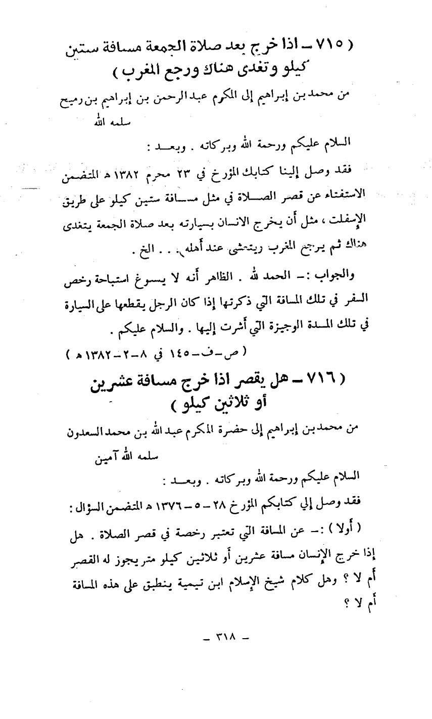 فقد وصل إلي كتابكم المؤرخ 28/5/1376هـ المتضمن السؤال: (أولاً) : عن المسافة التي تعتبر رخصة في قصر الصلاة. هل إذا خرج الإنسان مسافة عشرين أو ثلاثين كيلو متر يجوز له القصر أم لا؟ وهل كلام شيخ الإسلام ابن تيمية ينطبق على هذه المسافة أم لا؟