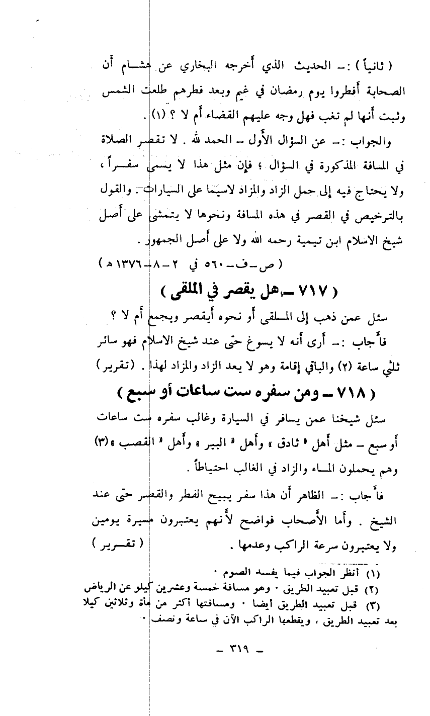 ولا يحتاج فيه إلى حمل الزاد والمزاد لا سيما على السيارات والقول بالترخيص في القصر في هذه المسافة ونحوها لا يتمشى على أصل شيخ الإسلام ابن تيمية رحمه الله ولا على أصل الجمهور.