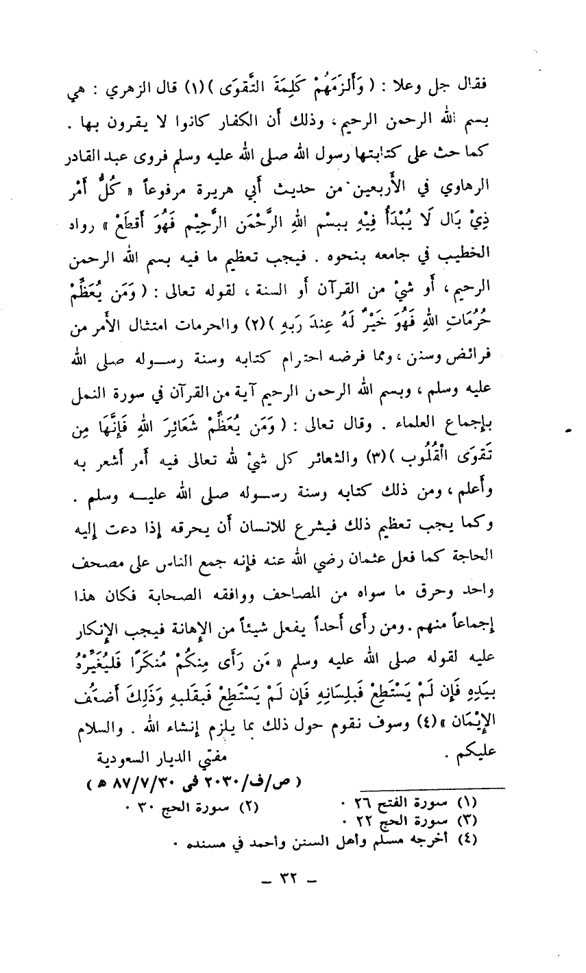 فقال جل وعلا: (*) (¬1) قال الزهري: هي بسم الله الرحمن الرحيم، وذلك أَن الكفار كانوا لا يقرون بها. كما حث على كتابتها رسول الله صلى الله عليه وسلم فروى عبد القادر الرهاوي في الأَربعين من حديث أَبي هريرة مرفوعًا ((كُلُّ أَمْر ذِيْ بَال لا يُبْدَأًُ فِيْهِ ببسْم اللهِ الرَّحْمَن الرَّحِيْم فَهُوَ أَقطَعْ)) رواه الخطيب في جامعه بنحوه. فيجب تعظيم ما فيه بسم الله الرحمن الرحيم، أَو شيء من القرآن أَو السنة، لقوله تعالى: (*) (¬2) والحرمات امتثال الأَمر من فرائض وسنن، ومما فرضه احترام كتابه وسنة رسوله صلى الله عليه وسلم، وبسم الله الرحمن الرحيم آية من القرآن في سورة النمل بإِجماع العلماء. وقال تعالى: (*) (¬3) والشعائر كل شيء لله تعالى فيه أَمر أَشعر به وأَعلم، ومن ذلك كتابه وسنة رسوله صلى الله عليه وسلم. وكما يجب تعظيم ذلك فيشرع للانسان أَن يحرقه إِذا دعت إِليه الحاجة كما فعل عثمان رضي الله عنه فإِنه جمع الناس على مصحف واحد وحرق ما سواه من المصاحف ووافقه الصحابة فكان هذا إِجماعًا منهم. ومن رأَى أَحدًا يفعل شيئًا من الإِهانة فيجب الإِنكار عليه لقوله صلى الله عليه وسلم ((مَن رَأَى مِنكُمْ مُنكَرًا فَليُغَيِّرْهُ بيَدِهِ فَإِن لَمْ يَسْتَطِعْ فَبلِسَانِهِ فَإِن لَمْ يَسْتَطِعْ فَبقَلبهِ وَذَلِكَ أَضعَفُ الإِيْمَان)) (¬4) وسوف نقوم حول ذلك بما يلزم إِنشاء الله. والسلام عليكم.