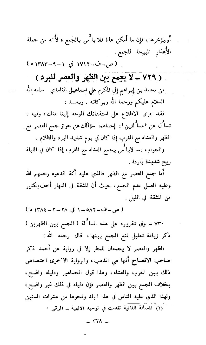 (729 ـ لا يجمع بين الظهر والعصر للبرد)