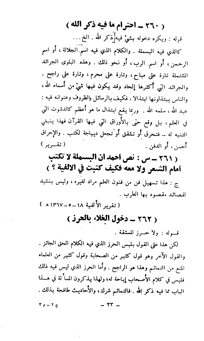 (261- س: نص أحمد أن البسملة لا تكتب أَمام الشعر ولا معه فكيف كتبت في الألفية؟)
