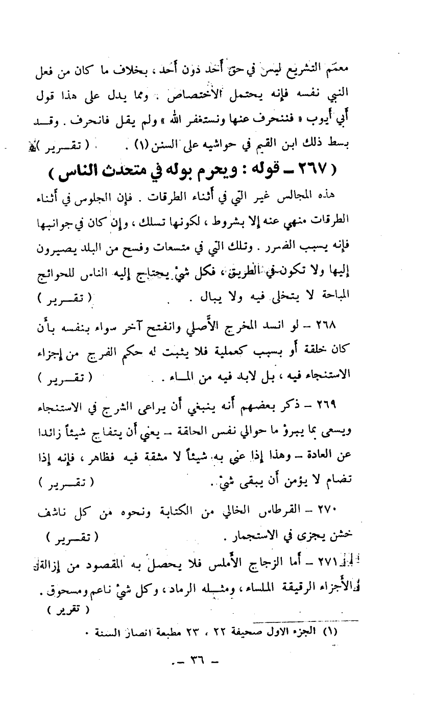 269- ذكر بعضهم أَنه ينبغي أَن يراعى الشرج في الاستنجاء ويسعى بما يبرؤ ما حوالي نفس الحلقة - يعني أَن يتفاج شيئًا زائدًا عن العادة - وهذا إِذا عنى به شيئًا لا مشقة فيه فظاهر، فإِنه إِذا تضام لا يؤمن أَن يبقى شيء. ... (تقرير)