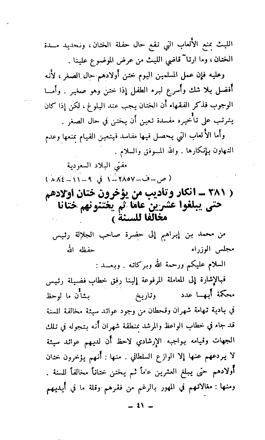 فبالإِشارة إِلى المعاملة المرفوعة رفق خطاب فضيلة رئيس محكمة أَبها عدد ... وتاريخ ... بشأْن ما لوحظ في بادية تهامة شهران وقحطان من وجود عوائد سيئة مخالفة للسنة قد جاء في خطاب الواعظ والمرشد بمنطقة شهران أَنه بتجوله في تلك الجهات وقيامه بواجبه الإِرشادي لاحظ أَن لديهم عوائد سيئة لا يردعهم عنها إِلا الوازع السلطاني. منها: أَنهم يؤخرون ختان أَولادهم حتى يبلغ العشرين عامًا ثم يختن ختانًا مخالفًا للسنة.