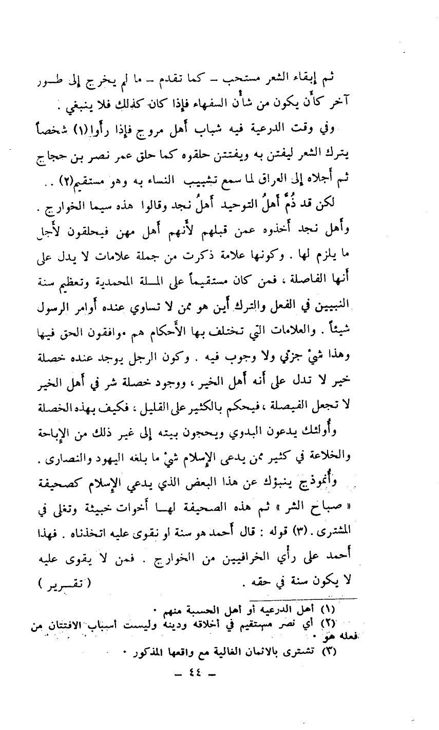 لكن قد ذمَّ أَهلُ التوحيد أَهلُ نجد وقالوا هذه سيما الخوارج. وأَهل نجد أَخذوه عمن قبلهم لأَنهم أَهل مهن فيحلقون لأَجل ما يلزم لها. وكونها علامة ذكرت من جملة علامات لا يدل على أَنها الفاصلة، فمن كان مستقيمًا على الملة المحمدية وتعظيم سنة النبيين في الفعل والترك أَين هو ممن لا تساوي عنده أَوامر الرسول شيئًا. والعلامات التي تختلف بها الأَحكام هم موافقون الحق فيها وهذا شيء جزئي ولا وجوب فيه. وكون الرجل يوجد عنده خصلة خير لا تدل على أَنه أَهل الخير، ووجود خصلة شر في أَهل الخير لا تجعل الفيصلة، فيحكم بالكثير على القليل، فكيف بهذه الخصلة وأُولئك يدعون البدوي ويحجون بيته إِلى غير ذلك من الإِباحة والخلاعة في كثير ممن يدعى الإسلام شيء ما بلغه اليهود والنصارى.