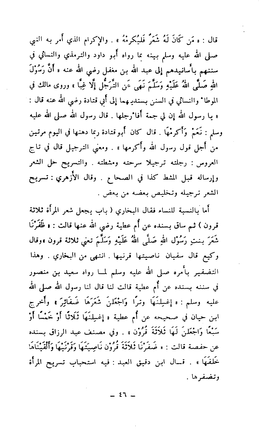 قال: ((مَن كَانَ لَهُ شَعَرٌ فَليُكرمْهُ)) . والإِكرام الذي أَمر به النبي صلى الله عليه وسلم بينه بما رواه أَبو داود والترمذي والنسائي في سننهم بأَسانيدهم إِلى عبد الله بن مغفل رضي الله عنه ((أَنَّ رَسُوْلَ اللهِ صَلَّى اللهُ عَلَيْهِ وَسَلَّمَ نَهَى عَن التَّرجُّل إِلاَّ غِبًّا)) وروى مالك في الموطأ والنسائي في السنن بسنديهما إِلى أَبي قتادة رضي الله عنه قال: ((يا رسول الله إِن لي جمة أَفأرجلها. قال رسول الله صلى الله عليه وسلم: نَعَمْ وَأَكرمْهَا. قال كان أَبو قتادة ربما دهنها في اليوم مرتين من أَجل قول رسول الله وأَكرمها)) . ومعنى الترجيل قال في تاج العروس: رجلته ترجيلا سرحته ومشطته. والتسريح حل الشعر وإِرساله قبل المشط كذا في الصحاح. وقال الأَزهري: تسريح الشعر ترجيله وتخليص بعضه من بعض.
