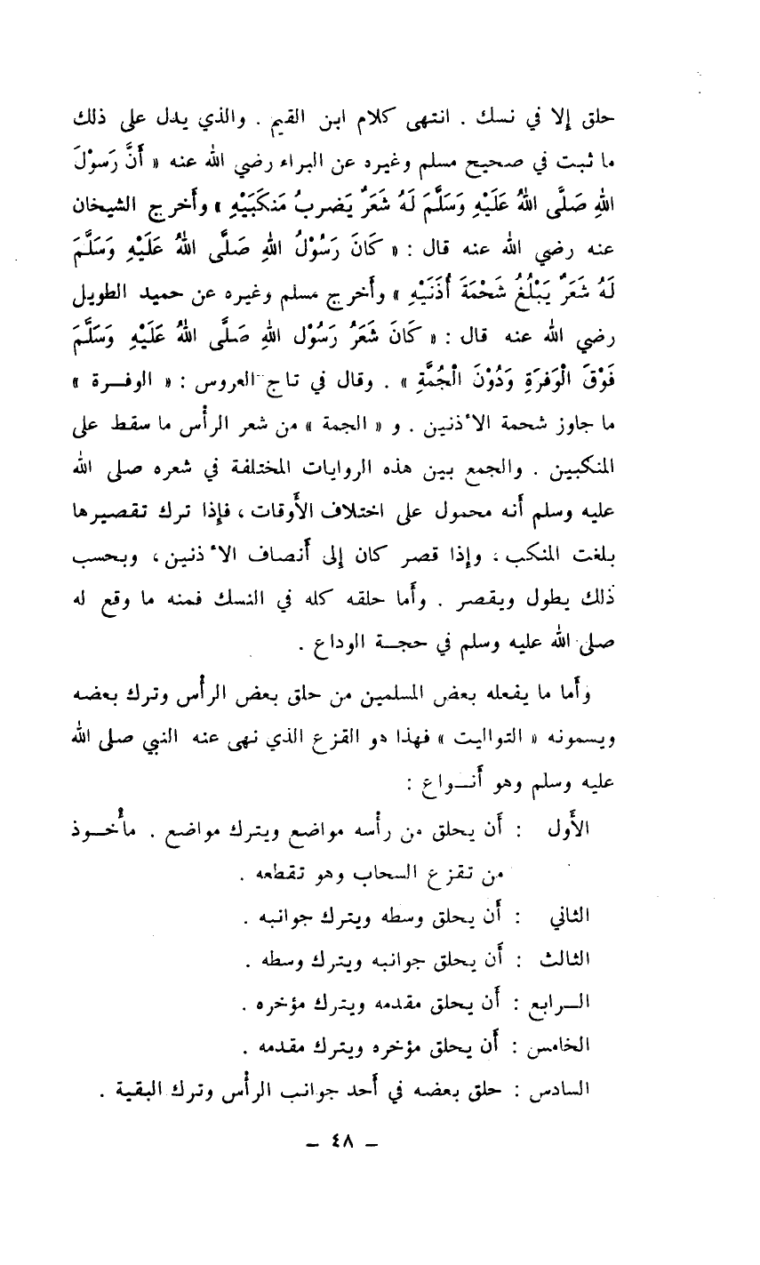 حلق إِلا في نسك. انتهى كلام ابن القيم. والذي يدل على ذلك ما ثبت في صحيح مسلم وغيره عن البراء رضي الله عنه ((أَنَّ رَسوْلَ اللهِ صَلَّى اللهُ عَلَيْهِ وَسَلَّمَ لَهُ شَعَرٌ يَضربُ مَنكَبَيْهِ)) وأَخرج الشيخان عنه رضي الله عنه قال: ((كَانَ رَسُوْلُ اللهِ صَلَّى اللهُ عَلَيْهِ وَسَلَّمَ لَهُ شَعَرٌ يَبْلُغُ شَحْمَةَ أُذَنَيْهِ)) وأَخرج مسلم وغيره عن حميد الطويل رضي الله عنه قال: ((كَانَ شَعَرُ رَسُوْل اللهِ صَلَّى اللهُ عَلَيْهِ وَسَلَّمَ فَوْقَ الْوَفرَةِ وَدُوْنَ الْجُمَّةِ)) . وقال في تاج العروس: ((الوفرة)) ما جاوز شحمة الأذنين. و ((الجمة)) من شعر الرأْس ما سقط على المنكبين. والجمع بين هذه الروايات المختلفة في شعره صلى الله عليه وسلم أَنه ممول على اختلاف الأَوقات، فإِذا ترك تقصيرها بلغت المنكب، وإِذا قصر كان إِلى أَنصاف الأذنين، وبحسب ذلك يطول ويقصر. وأَما حلقه كله في النسك فمنه ما وقع له صلى الله عليه وسلم في حجة الوداع.