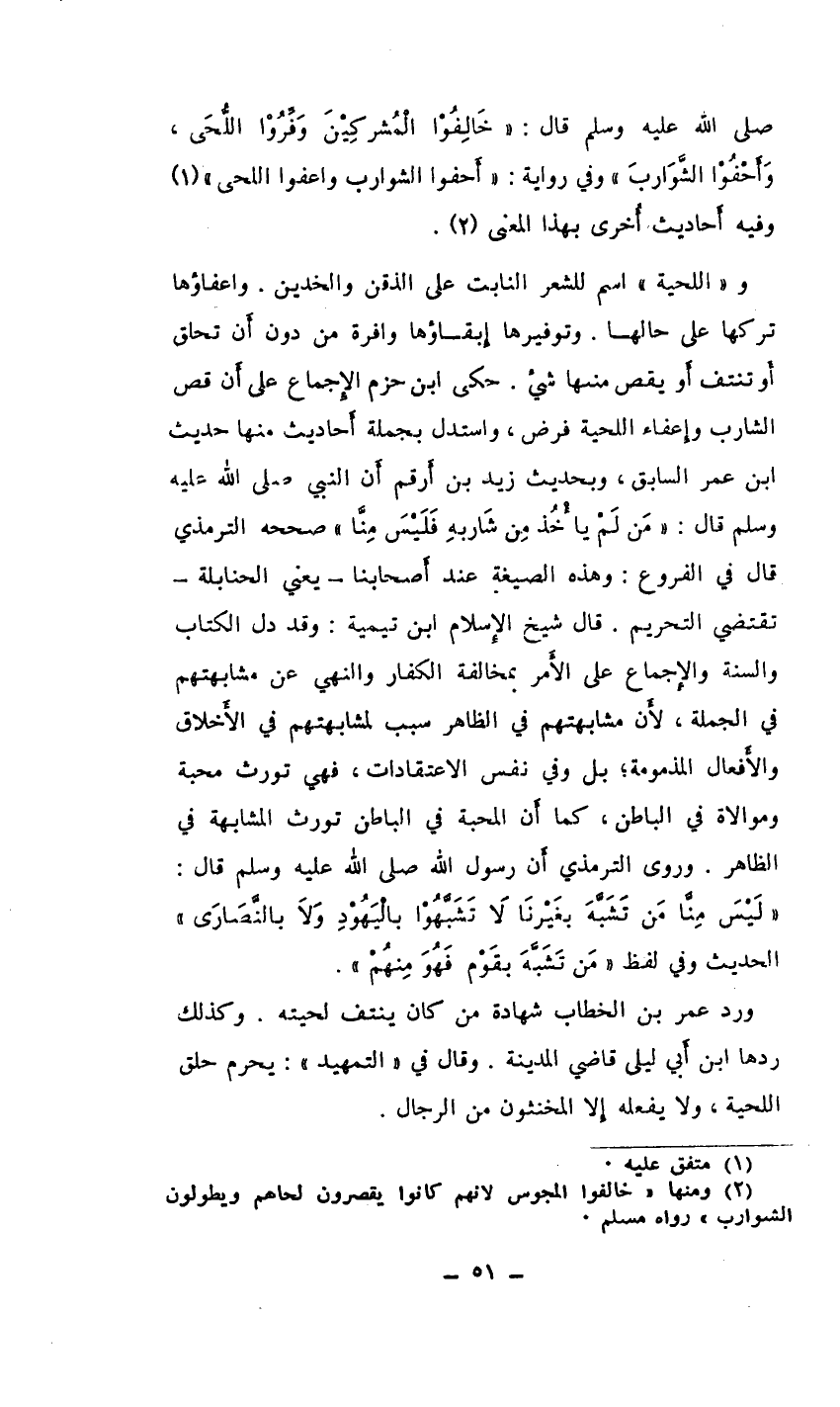 صلى الله عليه وسلم قال: ((خَالِفُوْا الْمُشركِيْنَ وَفِّرُوْا اللُّحَى، وَأَحْفُوْا الشَّوَاربَ)) وفي رواية: ((أَحفوا الشوارب واعفوا اللحى)) (¬1) وفيه أَحاديث أُخرى بهذا المعنى (¬2) .