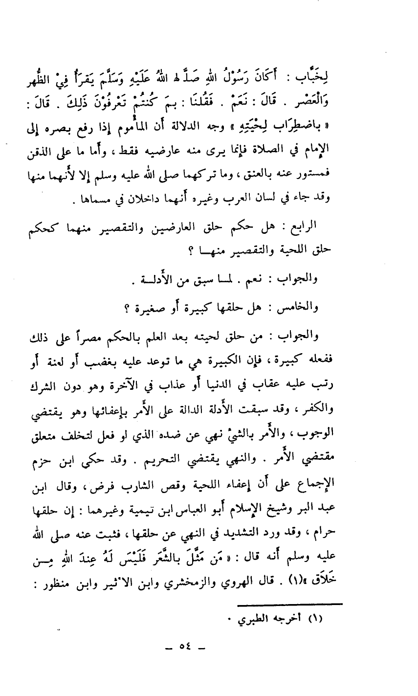 لِخَبَّاب: أَكَانَ رَسُوْلُ اللهِ صَلَّى اللهُ عَلَيْهِ وَسَلَّمَ يَقرَأُ فِيْ الظُّهر وَالْعَصْر. قَالَ: نَعَمْ. فَقُلنَا: بمَ كُنتُمْ تَعْرفُوْنَ ذَلِكَ. قَالَ: ((باضطِرَاب لِحْيَتِهِ)) وجه الدلالة أَن المأْموم إِذا رفع بصره إِلى الإِمام في الصلاة فإِنما يرى منه عارضيه فقط، وأَما ما على الذقن فمستور عنه بالعنق، وما تركهما صلى الله عليه وسلم إِلا لأَنهما منها وقد جاء في لسان العرب وغيره أَنهما داخلان في مسماها.
