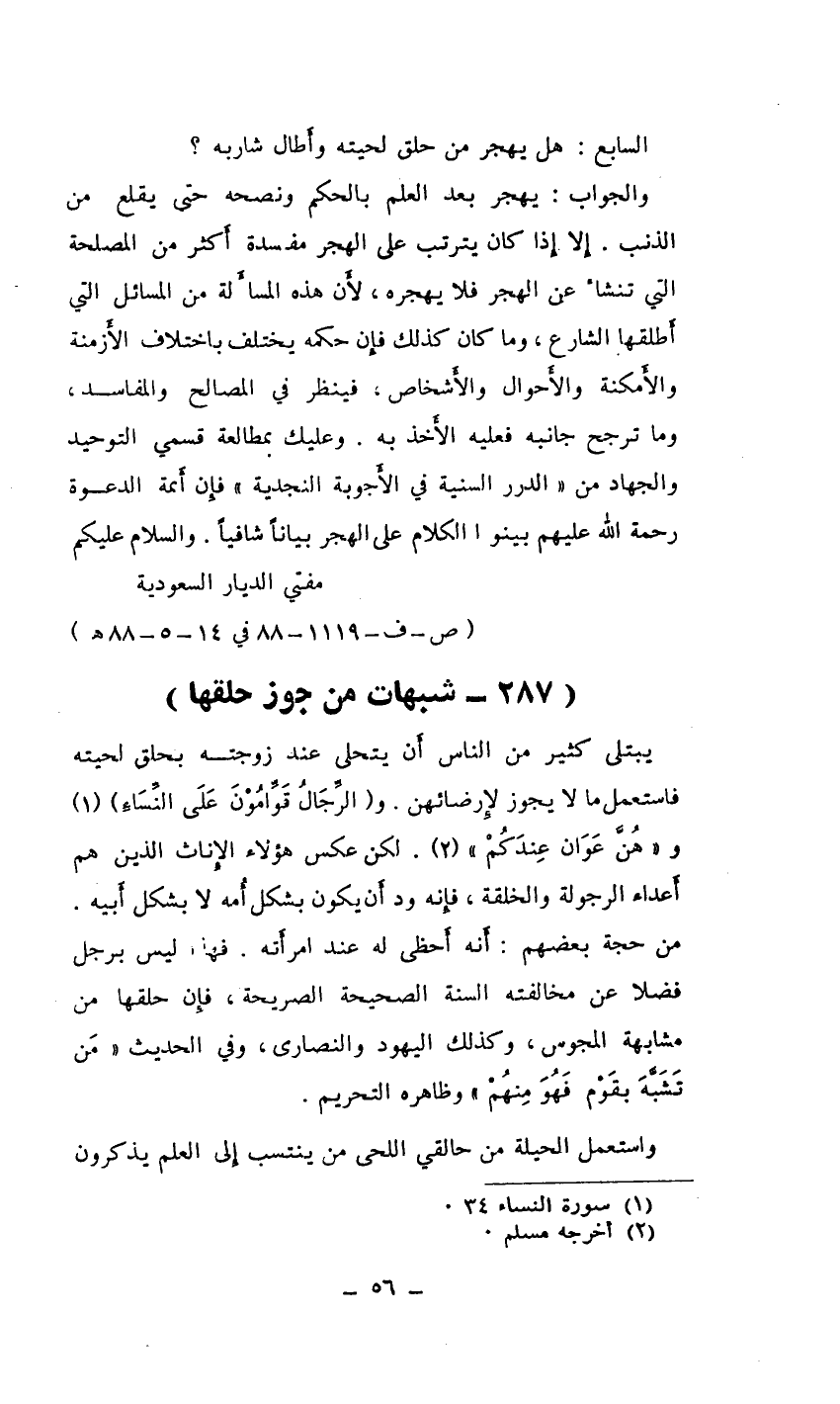 من حجة بعضهم: أَنه أَحظى له عند امرأَته. فهذا ليس برجل فضلا عن مخالفته السنة الصحيحة الصريحة، فإِن حلقها من مشابهة المجوس، وكذلك اليهود والنصارى، وفي الحديث ((مَن تَشَبَّهَ بقَوْم فَهُوَ مِنهُمْ)) وظاهره التحريم.
