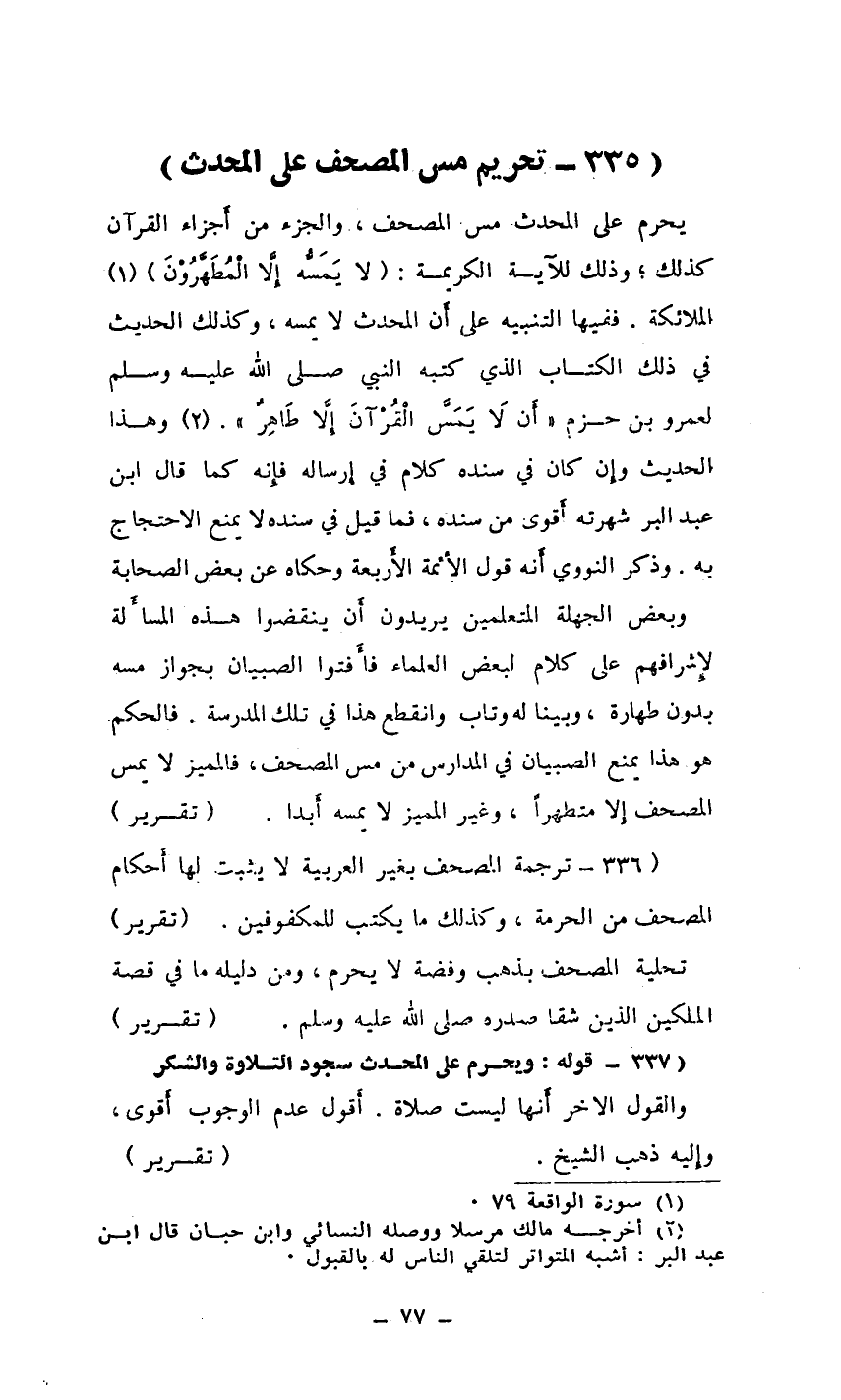 (336- ترجمة المصحف بغير العربية لا يثبت لها أَحكام المصحف من الحرمة، وكذلك ما يكتب للمكفوفين. ... (تقرير)