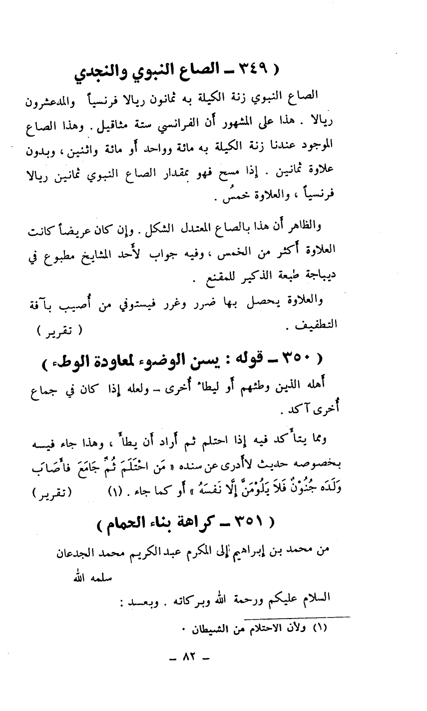 الصاع النبوي زنة الكيلة به ثمانون ريالا فرنسيًا والمد عشرون ريالا. هذا على المشهور أَن الفرانسي ستة مثاقيل. وهذا الصاع الموجود عندنا زنة الكيلة به مائة وواحد أَو مائة واثنين، وبدون علاوة ثمانين. إِذا مسح فهو بمقدار الصاع النبوي ثمانين ريال فرنسيًا، والعلاوة خمسُ.
