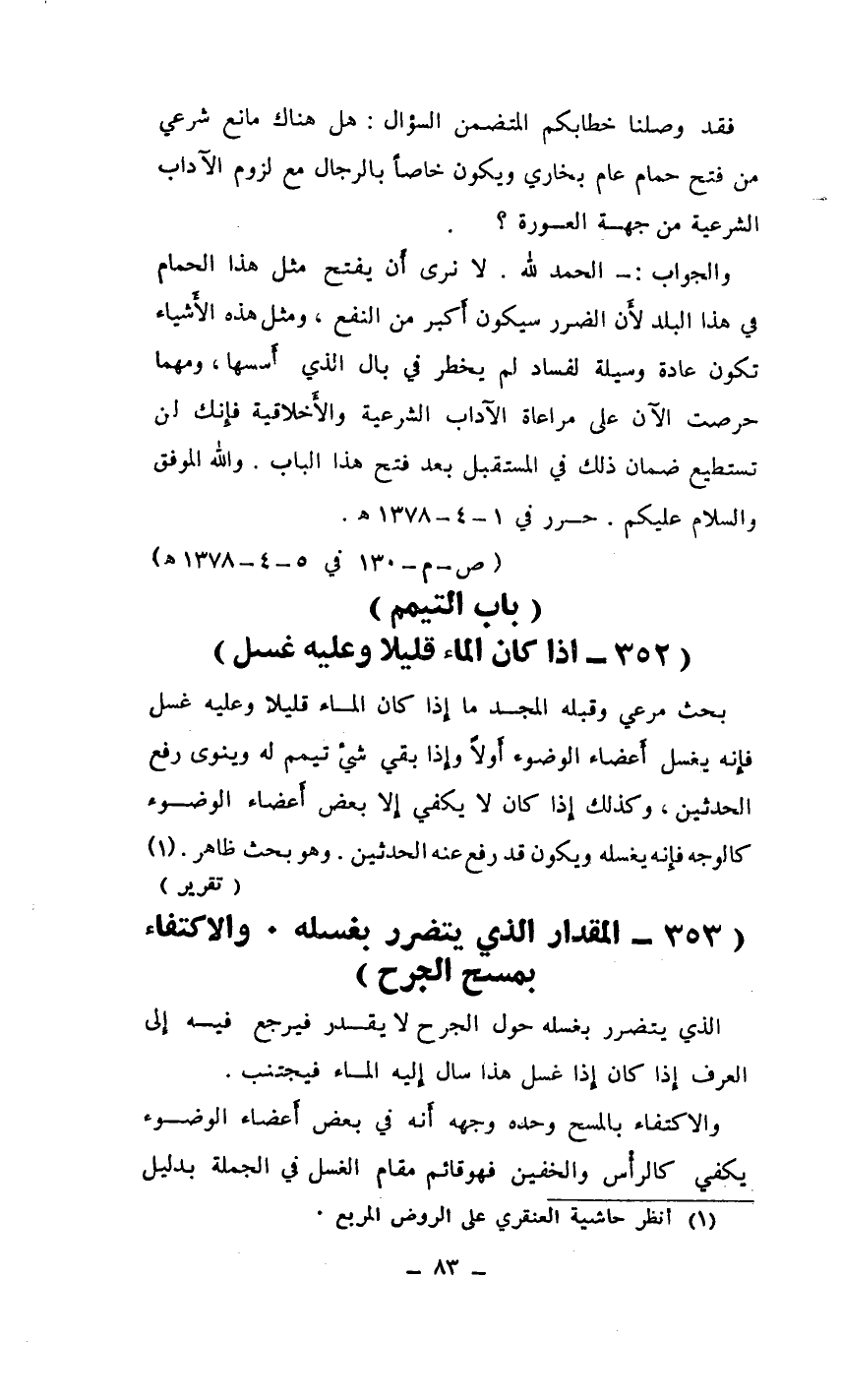 والجواب: - الحمد لله. لا نرى أَن يفتح مثل هذا الحمام في هذا البلد لأَن الضرر سيكون أَكبر من النفع، ومثل هذه الأَشياء تكون عادة وسيلة لفساد لم يخطر في بال الذي أَسسها، ومهما حرصت الآن على مراعاة الآداب الشرعية والأَخلاقية فإِنك لن تستطيع ضمان ذلك في المستقبل بعد فتح هذا الباب. والله الموفق والسلام عليكم. ... حرر في 1-4-1378 هـ.