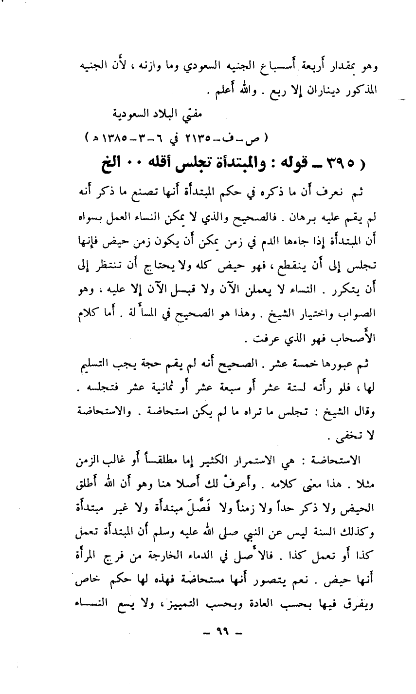 ثم نعرف أَن ما ذكره في حكم المبتدأَة أَنها تصنع ما ذكر أَنه لم يقم عليه برهان. فالصحيح والذي لا يمكن للنساء العمل بسواه أَن المبتدأَة إِذا جاءها الدم في زمن يمكن أَن يكون زمن حيض فإِنها تجلس إِلى أَن ينقطع، فهو حيض كله ولا يحتاج أَن تنتظر إِلى أَن يتكرر. النساء لا يعملن الآن ولا قبل الآن إِلا عليه، وهو الصواب واختيار الشيخ. وهذا هو الصحيح في المسأَلة. أَما كلام الأَصحاب فهو الذي عرفت.