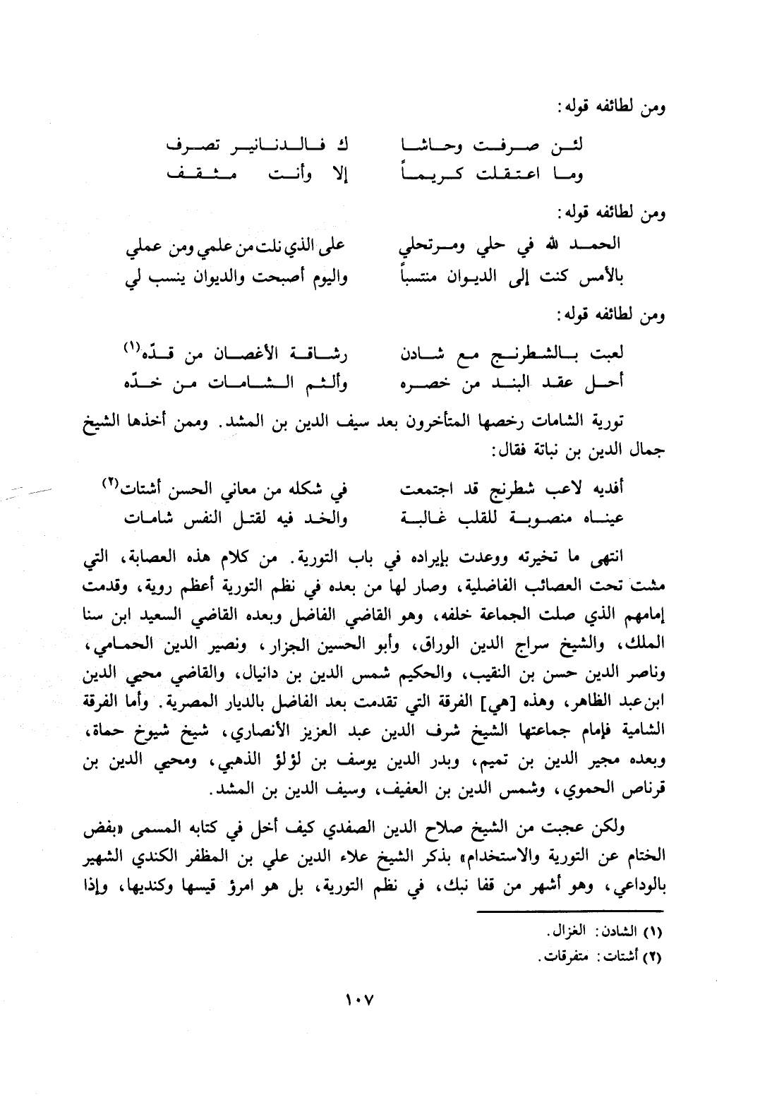 انتهى ما تخيرته ووعدت بإيراده في باب التورية. من كلام هذه العصابة، التي مشت تحت العصائب الفاضلية، وصار لها من بعده في نظم التورية أعظم روية، وقدمت إمامهم الذي صلت الجماعة خلفه، وهو القاضي الفاضل وبعده القاضي السعيد ابن سنا الملك، والشيخ سراج الدين الوراق، وأبو الحسين الجزار، ونصير الدين الحمامي، وناصر الدين حسن بن النقيب، والحكيم شمس الدين بن دانيال، والقاضي محيي الدين بن عبد الظاهر، وهذه "هي" الفرقة التي تقدمت بعد الفاضل بالديار المصرية. وأما الفرقة الشامية فإمام جماعتها الشيخ شرف الدين عبد العزيز الأنصاري، شيخ شيوخ حماة، وبعده مجير الدين بن تميم، وبدر الدين يوسف بن لؤلؤ الذهبي، ومحيي الدين بن قرناص الحموي، وشمس الدين بن العفيف، وسيف الدين بن المشد.