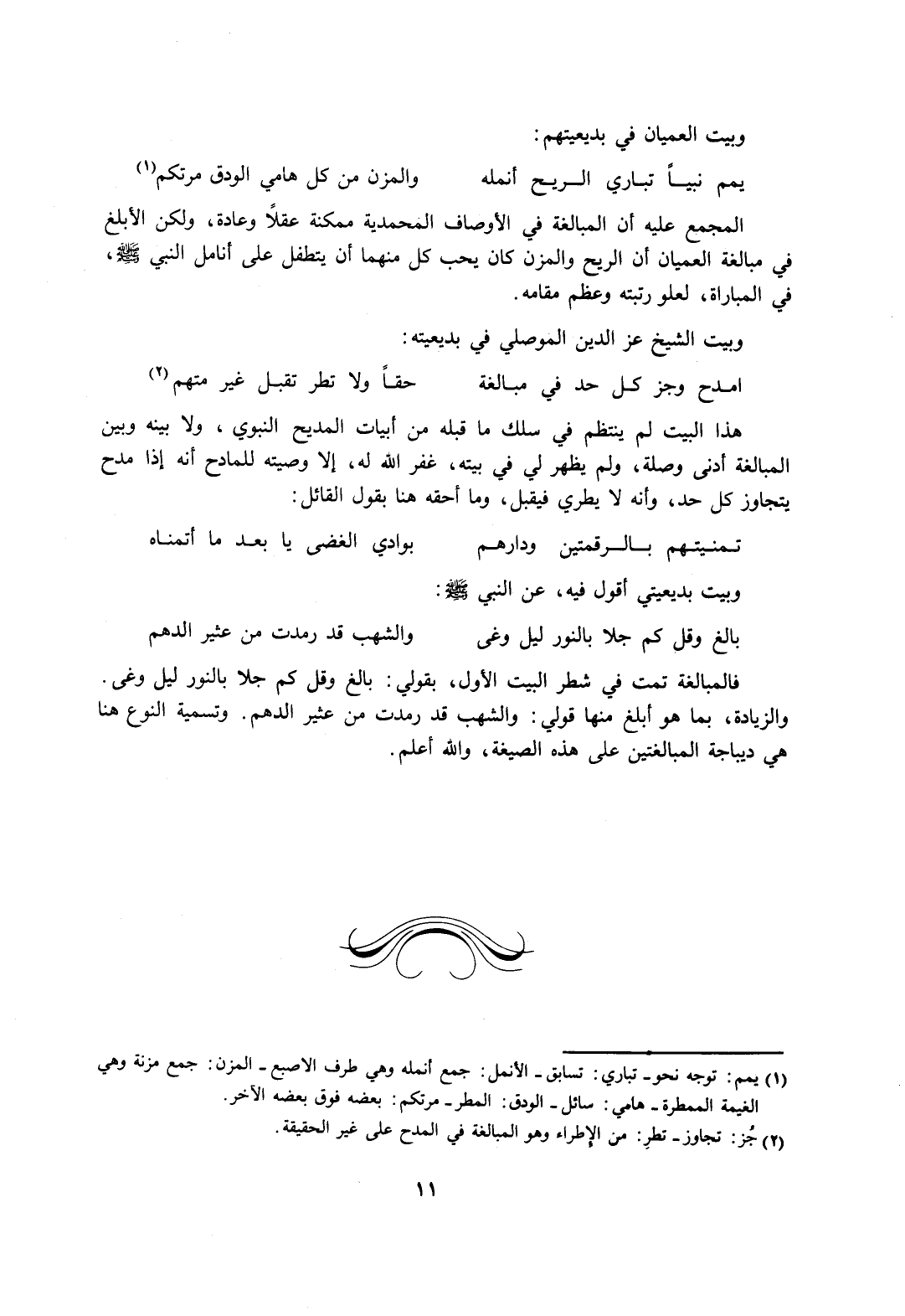 هذا البيت لم ينتظم في سلك ما قبله من أبيات المديح النبوي، ولا بينه وبين المبالغة أدنى وصلة، ولم يظهر لي في بيته، غفر الله له، إلا وصيته للمادح أنه إذا مدح يتجاوزكل حد، وأنه لا يطري فيقبل، وما أحقه هنا بقول القائل: