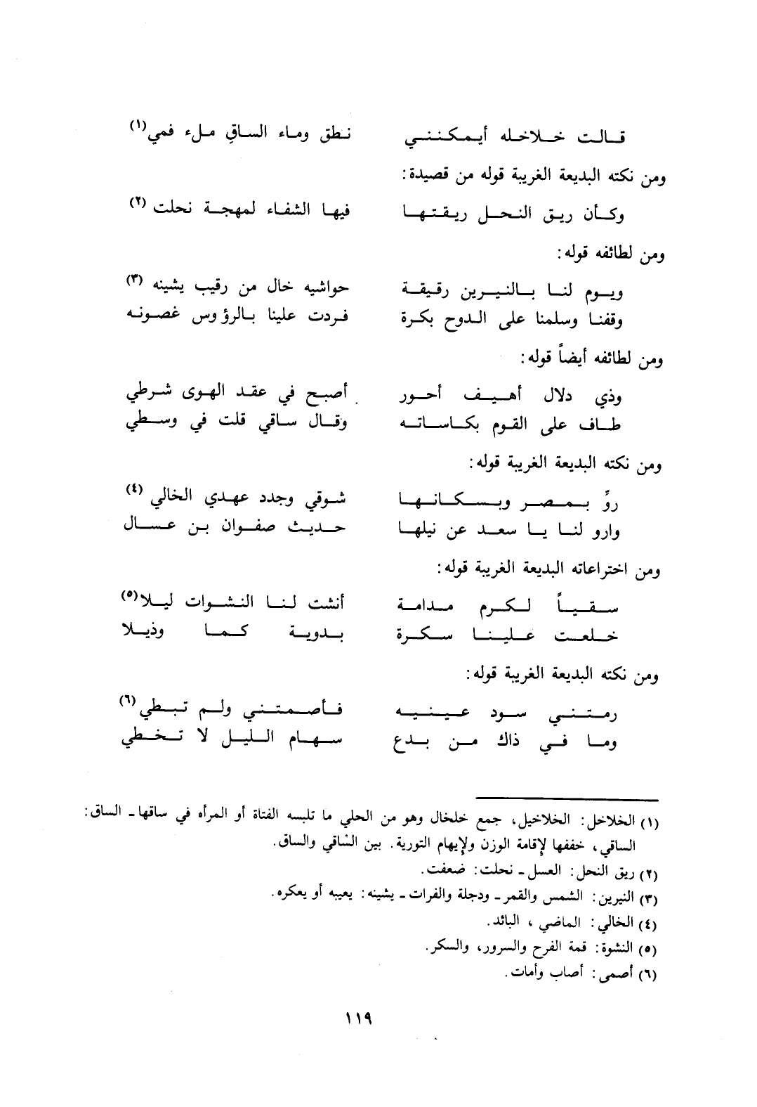 1 الخلاخل: الخلاخيل، جمع خلخال وهو من الحلي ما تلبسه الفتاة أو المرأة في ساقها. الساق: الساقي، خففها لإقامة الوزن ولإيهام التورية بين الساقي والساق.