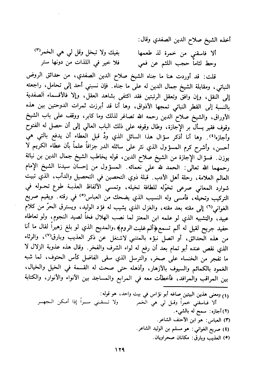 قلت: قد أوردت هنا ما جناه الشيخ صلاح الدين الصفدي، من حدائق الروض النباتي، ومقابلة الشيخ جمال الدين له على ما جناه: فإن نسبني أحد إلى تحامل، راجعته إلى النقل، وإن وافق وتعقل الرتبتين فقد اكتفى بشاهد العقل، وإلا فالأقسماء الصفدية بالنسبة إلى القطر النباتي تمجها الأذواق، وها أنا قد أبرزت ثمرات الدوحتين بين هذه الأوراق، والشيخ صلاح الدين -رحمه الله- تصاغر لذلك وما كابر، ووقف على باب الشيخ وقوف فقير يسأل بر الإجازة، وطال وقوفه على ذلك الباب العالي إلى أن حصل له الفتوح وأجازه2. وها أنا أذكر سؤال هذا السائل الذي ودَّ قبل العطاء أن يدفع بالتي هي أحسن، وأشرح كرم المسئول الذي نثر على سائله الدر جزافًا علمًا بأن عطاء الكريم لا يوزن. فسؤال الإجازة من الشيخ صلاح الدين، قوله يخاطب الشيخ جمال الدين بن نباتة، رحمهما الله تعالى: الحمد لله على نعمائه، المسئول من إحسان سيدنا الشيخ الإمام العالم العلامة، رحلة أهل الأدب. قبلة ذوي التحصين في التحصيل والدأب، الذي تبيت شوارد المعاني صرعى تخوله للطافة تخيله، وتمسي الألفاظ العذبة طوع تحوله في التركيب وتحيله، فأمسى وله النسيب الذي يضحك من العباس3 في رقته. ويقيم صريع الغواني4 إلى مقته بعد مقته، والغزل الذي يشيب له فؤاد الوليد، ويسترق الحر من كلام عبيد، والتشبيه الذي لو علمه ابن المعتز لما نصب الهلال فخًا لصيد النجوم، ولو تعاطاه حفيد جريح لقيل له ألم تسمع: {الم، غُلِبَتِ الرُّومُ} ، والمديح الذي لو بلغ زهيرًا لقال ما أنا من هذه الحدائق، أو اتصل نبؤه بالمتنبي لاشتغل عن ذكر العذيب وبارق5، والرثاء الذي نقص عنده أبو تمام بعد أن رفع له لواء الشرف والفخر. وقال هذه عذوبة الزلال لا ما تفجر من الخنساء على صخر، والترسل الذي سقى الفاضل كأس الحتوف، لما شبه الغمود بالكمائم والسيوف بالأزهار، وأذهله حتى صحت له القسمة في الخيل والخيال، بين المراقب والمرافد، فأخطأت معه في المرابع والمساجد بين الأنواء والأنوار، والكتابة