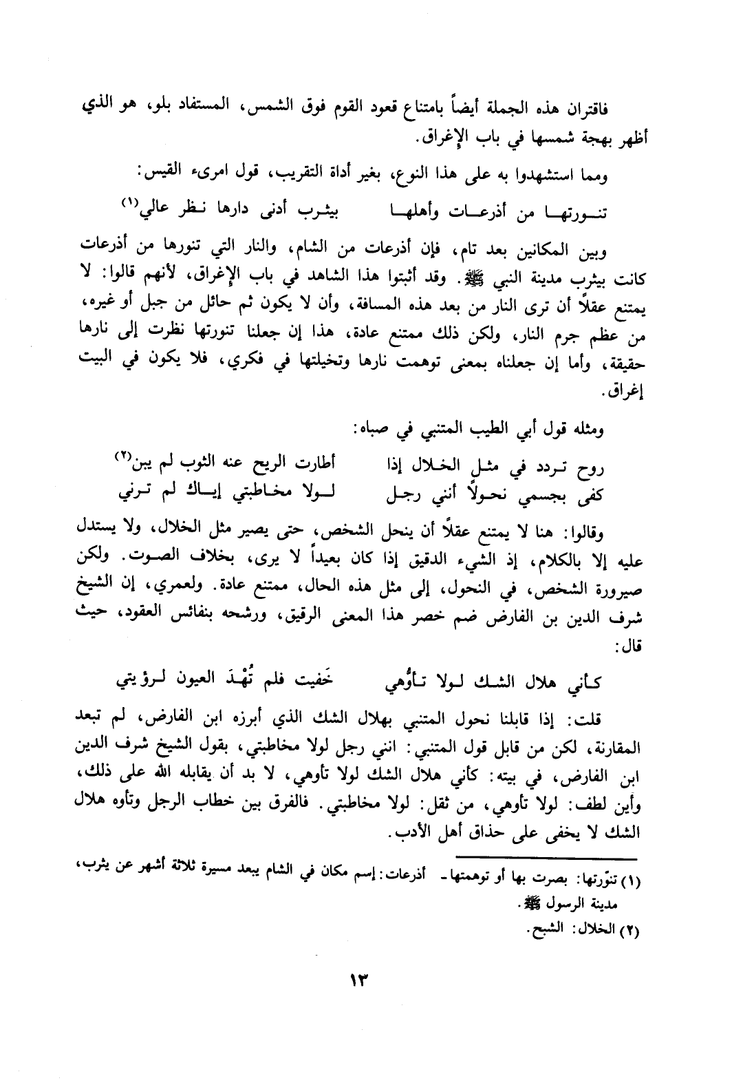 وبين المكانين بعد تام، فإن أذرعات من الشام، والنار التي تنورها من أذرعات كانت بيثرب مدينة النبي -صلى الله عليه وسلم- وقد أثبتوا هذا الشاهد في باب الإغراق، لأنهم قالوا: لا يمتنع عقلًا أن ترى النار من بعد هذه المسافة، وأن لا يكون ثم حائل من جبل أو غيره، من عظم جرم النار، ولكن ذلك ممتنع عادة، هذا إن جعلنا تنورتها نظرت إلى نارها حقيقة، وأما إن جعلناه بمعنى توهمت نارها وتخيلتها في فكري، فلا يكون في البيت إغراق.