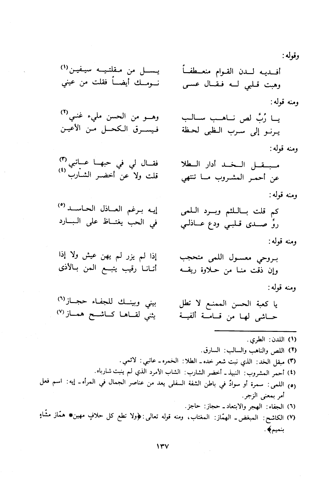 5 اللمى: سمرة أو سواد في باطن الشفة السفلى يعد من عناصر الجمال في المرأة. إيه: اسم فعل أمر بمعنى الزجر.
