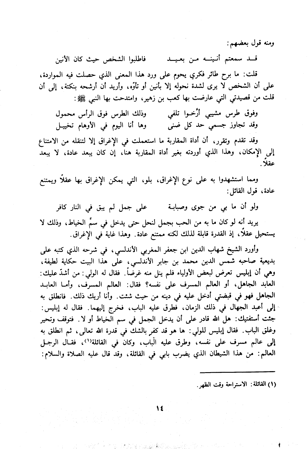 وأورد الشيخ شهاب الدين ابن جعفر المغربي الأندلسي، في شرحه الذي كتبه على بديعية صاحبه شمس الدين محمد بن جابر الأندلسي، على هذا البيت حكاية لطيفة، وهي أن إبليس تعرض لبعض الأولياء فلم ينل منه غرضًا. فقال له الولي: من أشد عليك: العابد الجاهل، أو العالم المسرف على نفسه؟ فقال: العالم المسرف، وأما العابد الجاهل فهو في قبضتي أدخل عليه في دينه من حيث شئت. وأنا أريك ذلك. فانطلق به إلى أعبد الجهال في ذلك الزمان، فطرق عليه الباب، فخرج إليهما. فقال له إبليس: جئت أستفتيك: هل الله قادر على أن يدخل الجمل في سم الخياط أو لا. فتوقف وتحير وغلق الباب. فقال إبليس للولي: ها هو قد كفر بالشك في قدرة الله تعالى، ثم انطلق به إلى عالم مسرف على نفسه، وطرق عليه الباب، وكان في القائلة1، فقال الرجل العالم: من هذا الشيطان الذي يضرب بابي في القائلة، وقد قال عليه الصلاة والسلام: