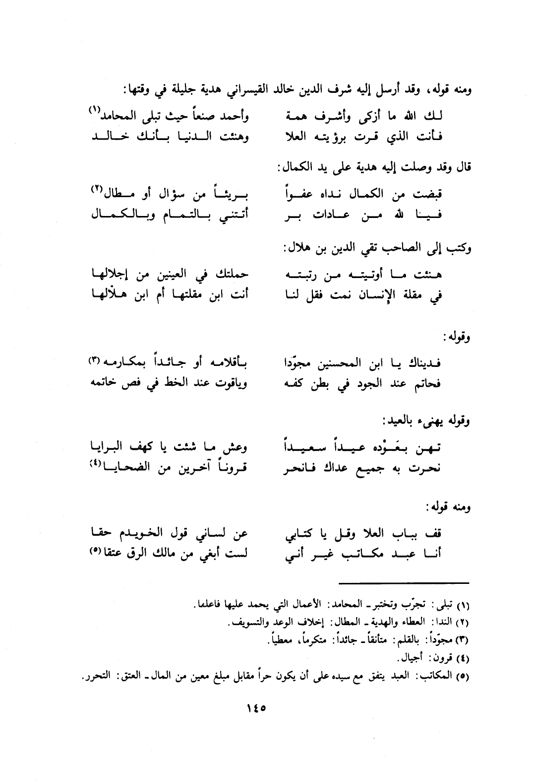 ومنه قوله وقد أرسل إليه شرف الدين خالد القيسراني هدية جليلة في وقتها: