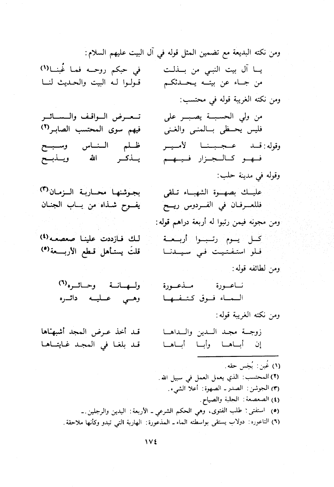ومن نكته البديعة مع تضمين المثل قوله في آل البيت عليهم السلام: