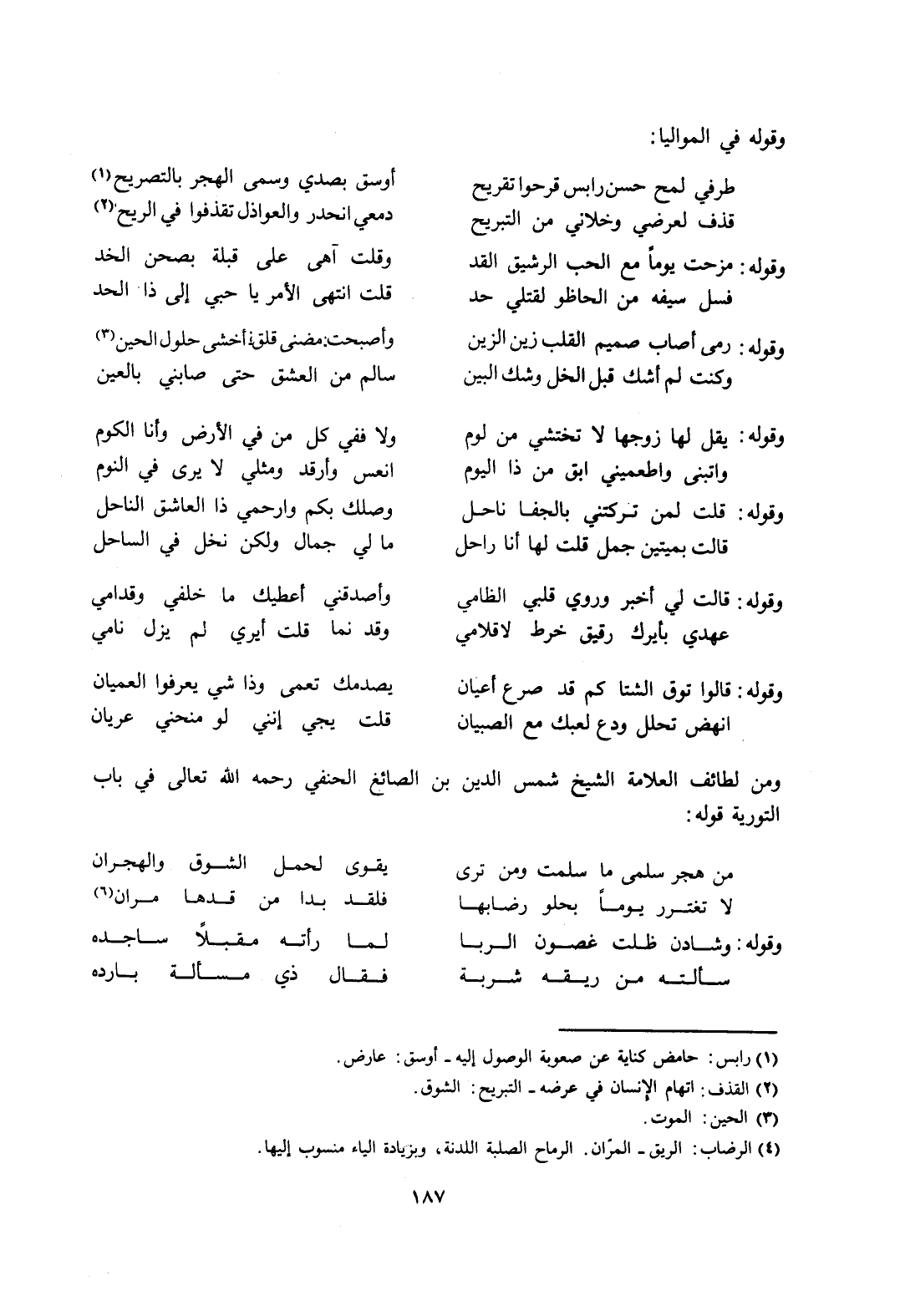ومن لطائف العلامة الشيخ شمس الدين بن الصائغ الحنفي -رحمه الله تعالى- في باب التورية قوله: