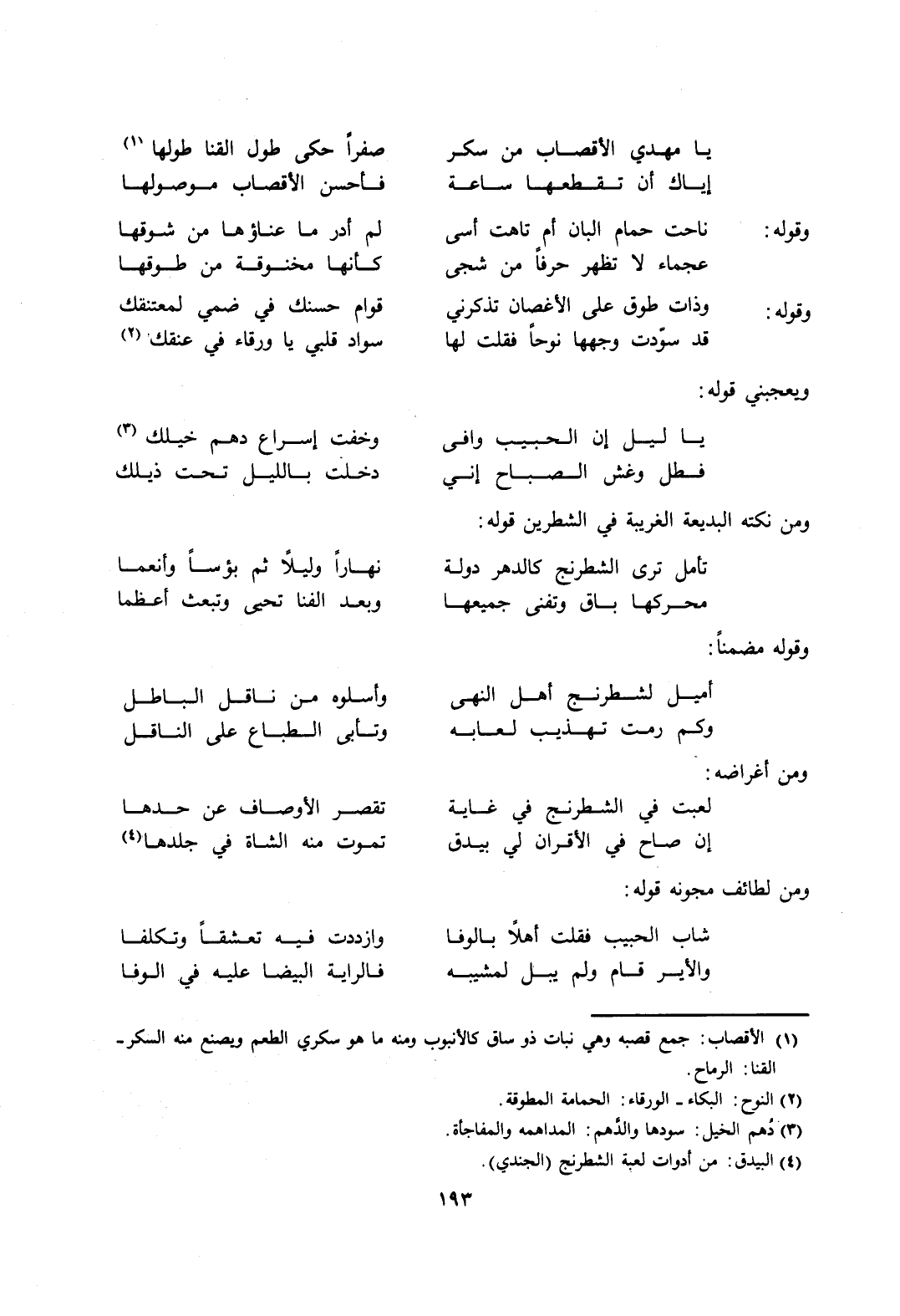 1 الأقصاب: جمع قصبة وهي نبات ذو ساق كالأنبوب ومنه ما هو سكري الطعم ويصنع منه السكر. القنا: الرماح.