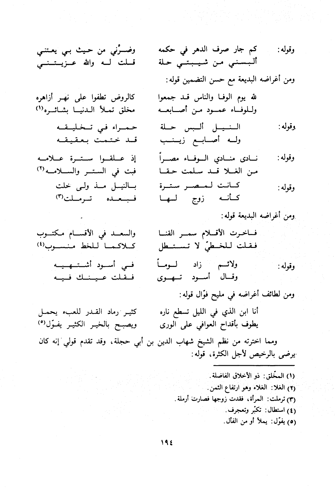 ومما اخترته من نظم الشيخ شهاب الدين بن أبي حجلة، وقد تقدم قولي: إنه كان يرضى بالرخيص لأجل الكثرة، قوله: