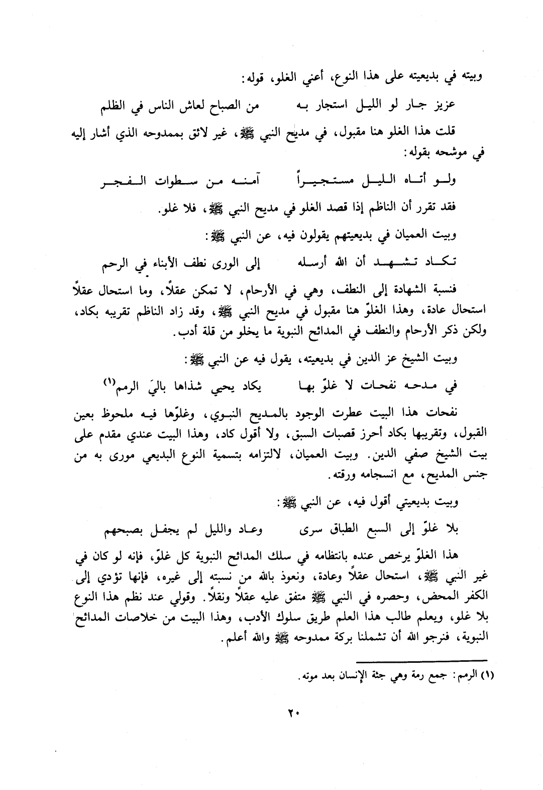 هذا الغلوّ يرخص عنده بانتظامه في سلك المدائح النبوية كل غلو، فإنه لو كان في غير النبي -صلى الله عليه وسلم- استحال عقلًا وعادة، ونعوذ بالله من نسبته إلى غيره، فإنها تؤدي إلى الكفر المحض، وحصره في النبي -صلى الله عليه وسلم- متفق عليه عقلًا ونقلًا. وقولي عند نظم هذا النوع بلا غلو، ويعلم طالب هذا العلم طريق سلوك الأدب، وهذا البيت من خلاصات المدائح النبوية، فنرجو الله أن تشملنا بركة ممدوحه، صلى الله عليه وسلم، والله أعلم.