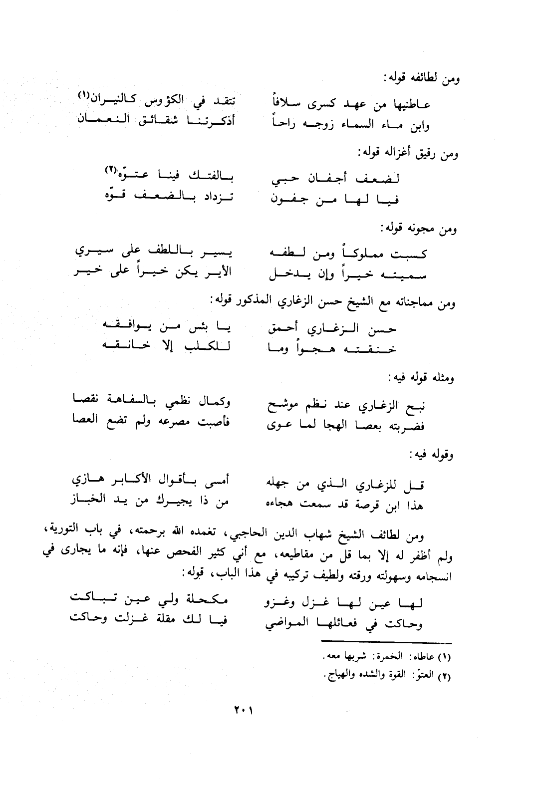 ومن لطائف الشيخ شهاب الدين الحاجبي -تغمده الله برحمته- في باب التورية، ولم أظفر له إلا بما قل من مقاطيعه، مع أني كثير الفحص عنها، فإنه ما يجاري في انسجامه وسهولته ورقته ولطيف تركيبه في هذا الباب، قوله: