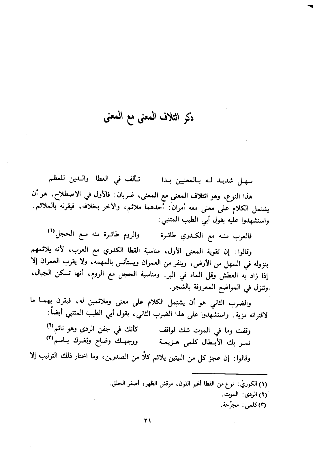 هذا النوع، وهو ائتلاف المعنى مع المعنى، ضربان: فالأول في الاصطلاح، هو أن يشتمل الكلام على معنى معه أمران: أحدهما ملائم، والآخر بخلافه، فيقرنه بالملائم. واستشهدوا عليه بقول أبي الطيب المتنبي: