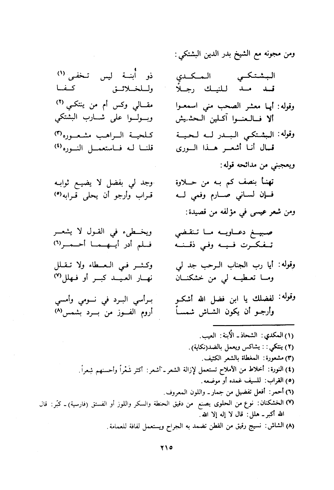 7 الخشكنان: نوع من الحلوى يضع من دقيق الحنطة والسكر واللوز أو الفستق "فارسية". كبّر: قال الله أكبر. هلل: قال لا إله إلا الله.