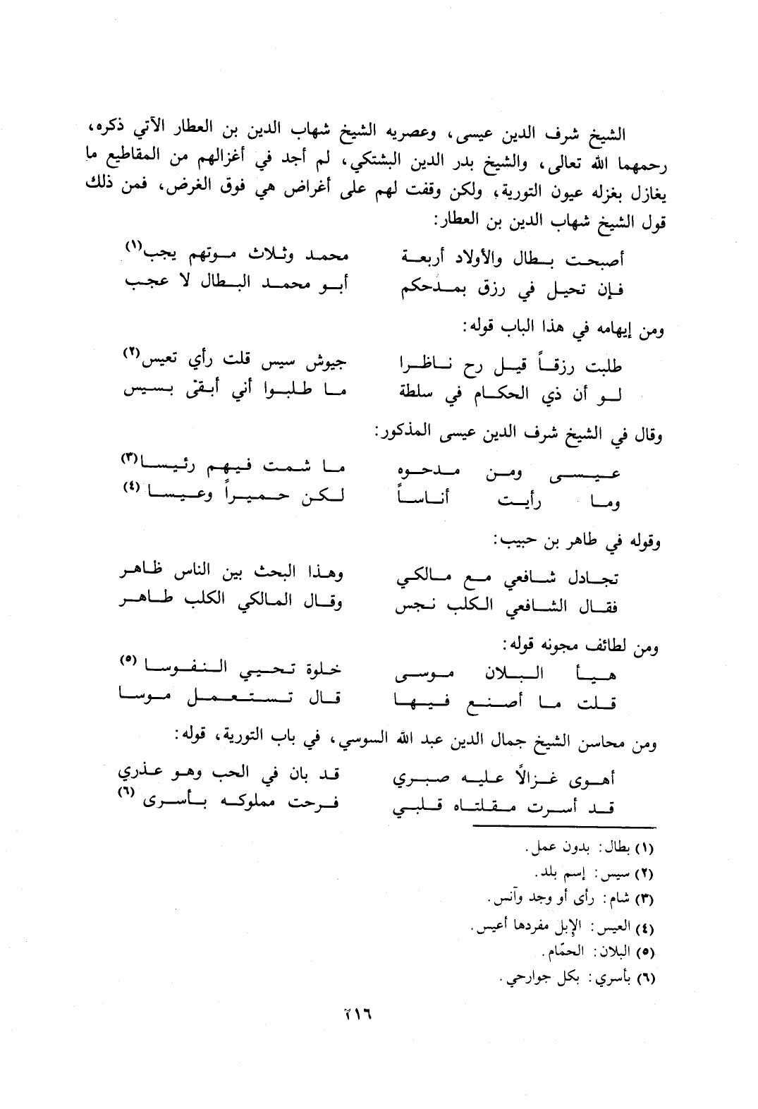 الشيخ شرف الدين عيسى، وعصريه الشيخ شهاب الدين بن العطار الآتي ذكره -رحمهما الله تعالى- والشيخ بدر الدين البشتكي، لم أجد في أغزالهم من المقاطيع ما يغازل بغزله عيون التورية، ولكن وقفت لهم على أغراض هي فوق الغرض، فمن ذلك قول الشيخ شهاب الدين بن العطار: