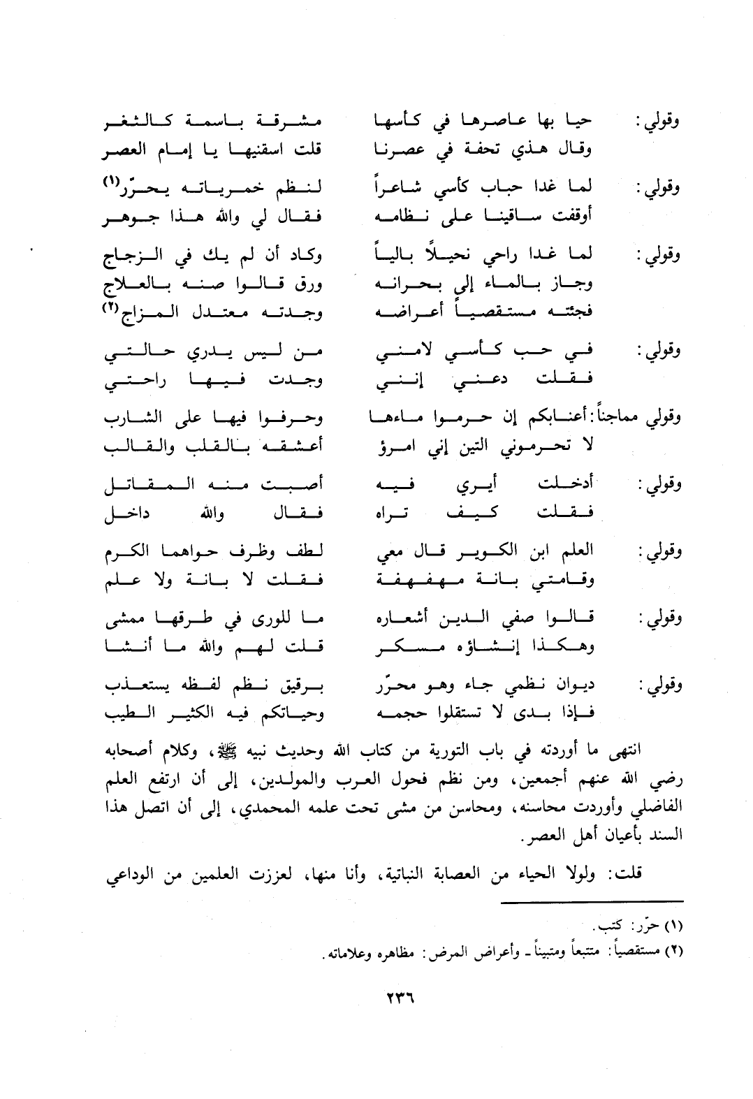 انتهى ما أوردته في باب التورية من كتاب الله وحديث نبيه -صلى الله عليه وسلم- وكلام أصحابه -رضي الله عنهم أجمعين- ومن نظم فحول العرب والمولدين، إلى أن ارتفع العلم الفاضلي وأوردت محاسنه، ومحاسن من مشى تحت علمه المحمدي، إلى أن اتصل هذا السند بأعيان أهل العصر.