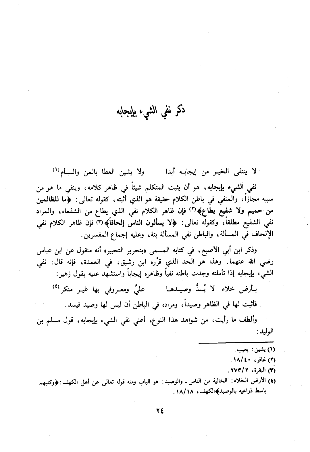 وذكر ابن أبي الأصبع، في كتابه المسمى: "بتحرير التحبير" أنه منقول عن ابن عباس، رضي الله عنهما. وهذا هو الحد الذي قرره ابن رشيق، في العمدة، فإنه قال: نفي الشيء بإيجابه إذا تأملته وجدت باطنه نفيًا وظاهره إيجابًا واستشهد عليه بقول زهير: