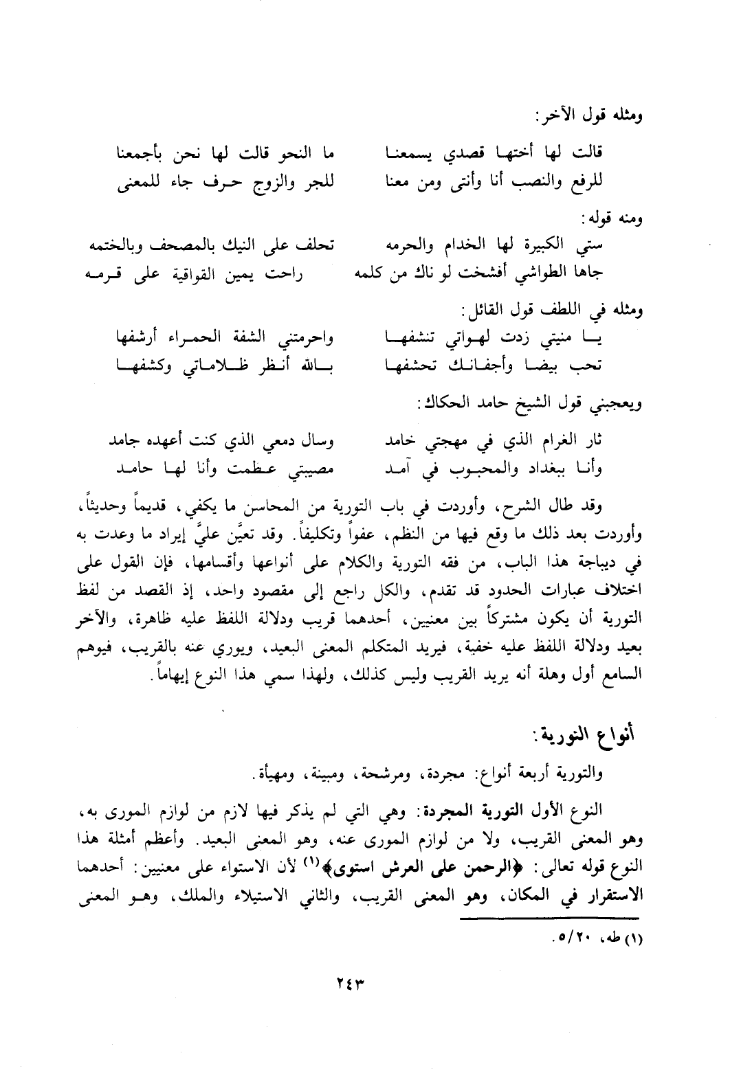 النوع الأول التورية المجردة: وهي التي لم يذكر فيها لازم من لوازم المورى به، وهو المعنى القريب، ولا من لوازم المورى عنه، وهو المعنى البعيد. وأعظم أمثلة هذا النوع قوله تعالى: {الرَّحْمَنُ عَلَى الْعَرْشِ اسْتَوَى} [ط: 5/ 20] ؛ لأن الاستواء على معنيين: أحدهما الاستقرار في المكان، وهو المعنى القريب، والثاني الاستيلاء والملك، وهو المعنى
