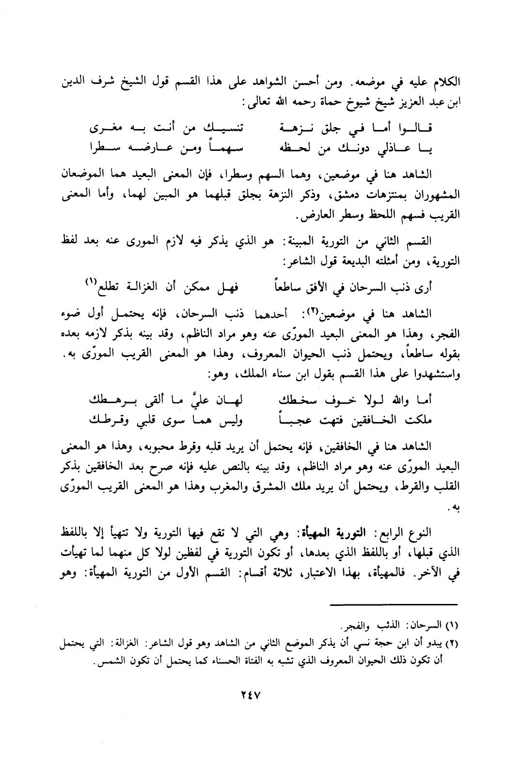 الكلام عليه في موضعه. ومن أحسن الشواهد على هذا القسم قول الشيخ شرف الدين بن عبد العزيز شيخ شيوخ حماة، رحمه الله تعالى:
