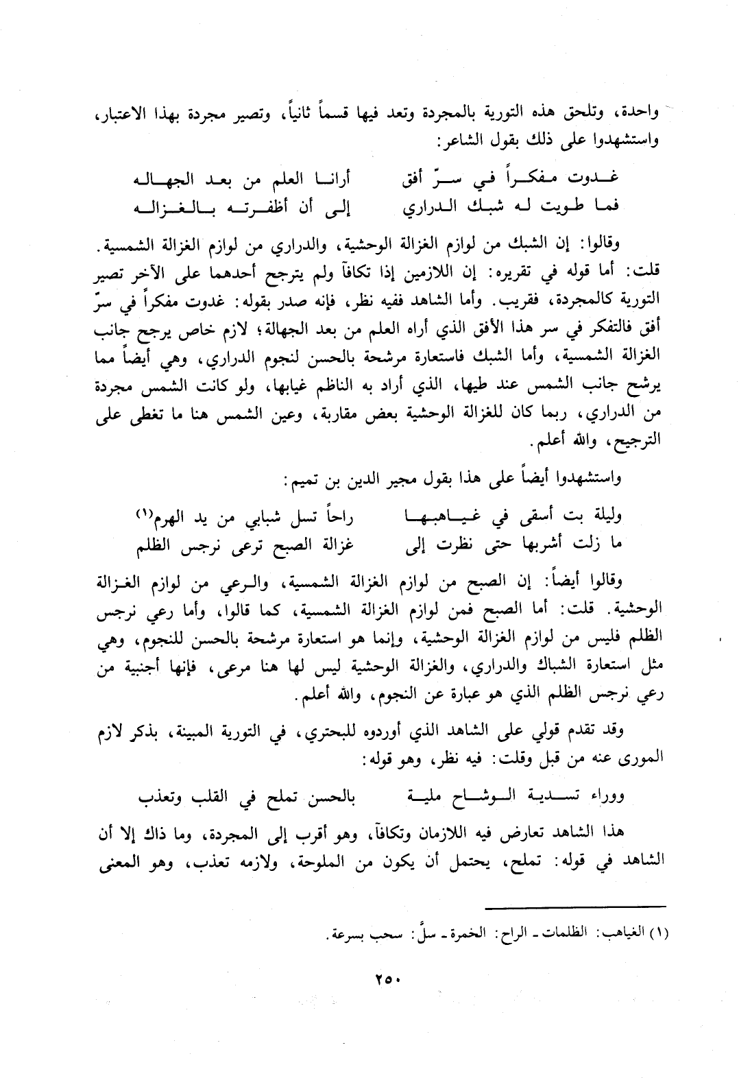 وقالوا: إن الشبك من لوازم الغزالة الوحشية، والدراري من لوازم الغزالة الشمسية. قلت: أما قوله في تقريره: إن اللازمين إذا تكافآ ولم يترجح أحدهما على الآخر تصير التورية كالمجردة، فقريب. وأما الشاهد ففيه نظر، فإنه صدر بقوله: غدوت مفكرًا في سرّ أفق فالتفكر في سرّ هذا الأفق الذي أراه العلم من بعد الجهالة؛ لازم خاص يرجح جانب الغزالة الشمسية، وأما الشبك فاستعارة مرشح بالحسن لنجوم الدراري، وهي أيضًا مما يرشح جانب الشمس عند طيها، الذي أراد به الناظم غيابها، ولو كانت الشمس مجردة من الدراري، ربما كان للغزالة الوحشية بعض مقاربة، وعين الشمس هنا ما تغطى على الترجيح، والله أعلم.