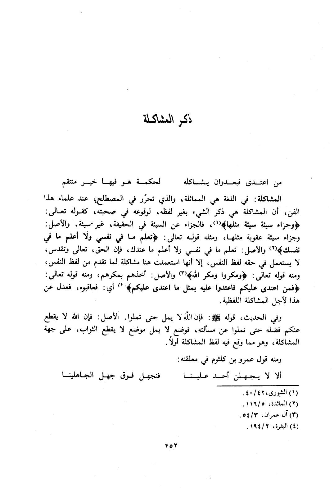 المشاكلة: في اللغة هي المماثلة، والذي تحرر في المصطلح، عند علماء هذا الفن، أن المشاكلة هي ذكر الشيء بغير لفظه، لوقوعه في صحبته، كقوله تعالى: {وَجَزَاءُ سَيِّئَةٍ سَيِّئَةٌ مِثْلُهَا} 1، فالجزاء عن السيئة في الحقيقة، غير سيئة، والأصل: وجزاء سيئة عقوبة مثلها، ومثله قوله تعالى: {تَعْلَمُ مَا فِي نَفْسِي وَلا أَعْلَمُ مَا فِي نَفْسِكَ} 2 والأصل: تعلم ما في نفسي ولا أعلم ما عندك، فإن الحق، تعالى وتقدس، لا يستعمل في حقه لفظ النفس، إلا أنها استعملت هنا مشاكلة لما تقدم من لفظ النفس، ومنه قوله تعالى: {وَمَكَرُوا وَمَكَرَ اللَّهُ} 3 والأصل: أخذهم بمكرهم، ومنه قوله تعالي: {فَمَنِ اعْتَدَى عَلَيْكُمْ فَاعْتَدُوا عَلَيْهِ بِمِثْلِ مَا اعْتَدَى عَلَيْكُمْ} 4 أي: فعاقبوه، فعدل عن هذا لأجل المشاكلة اللفظية.