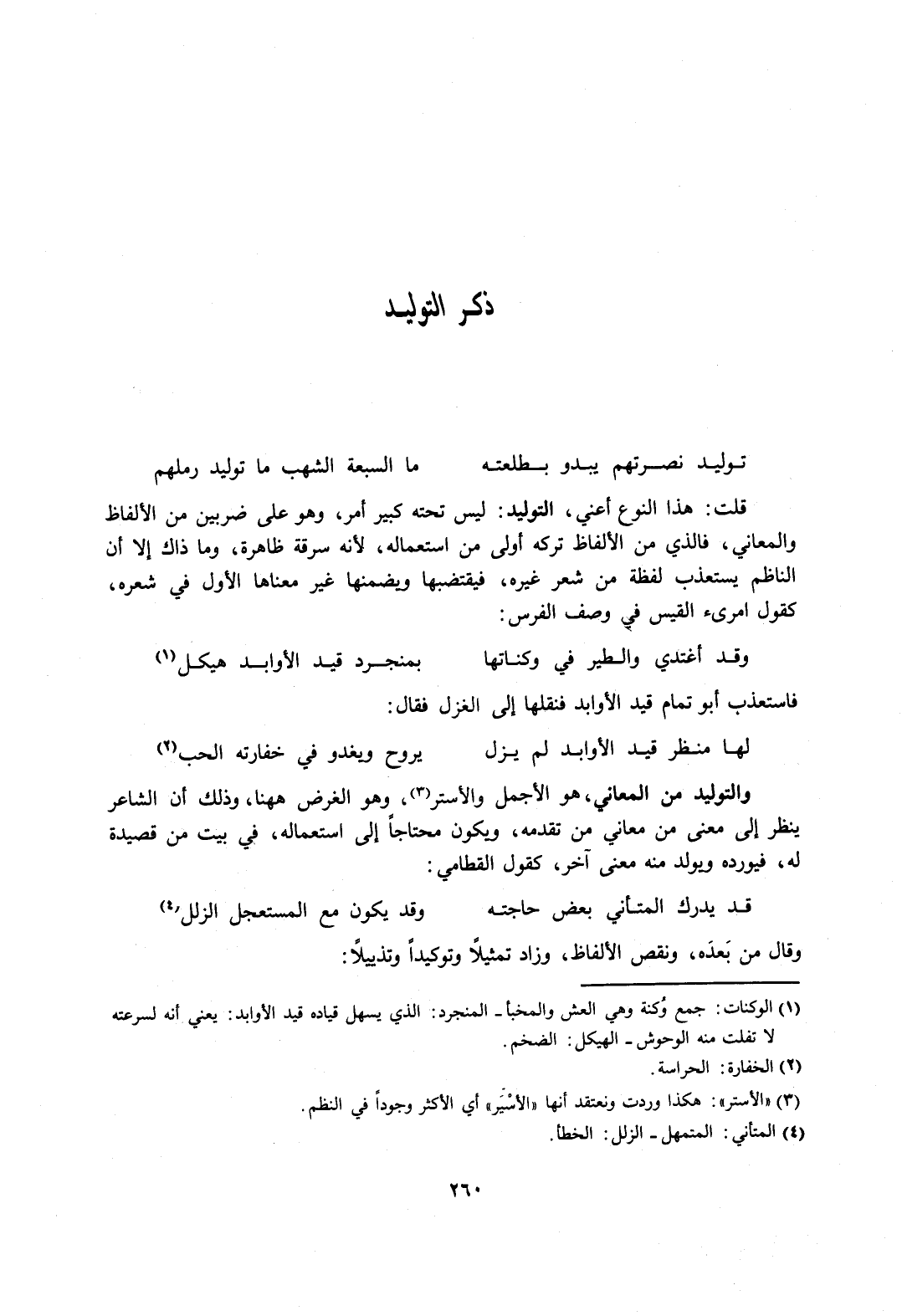 قلت: هذا النوع أعني، التوليد: ليس تحته كبير أمر، وهو على ضربين من الألفاظ والمعاني، فالذي من الألفاظ تركه أولى من استعماله؛ لأنه سرقة ظاهرة، وما ذاك إلا أن الناظم يستعذب لفظة من شعر غيره، فيقتضبها ويضمنها غير معناها الأول في شعره، كقول امرئ القيس في وصف الفرس: