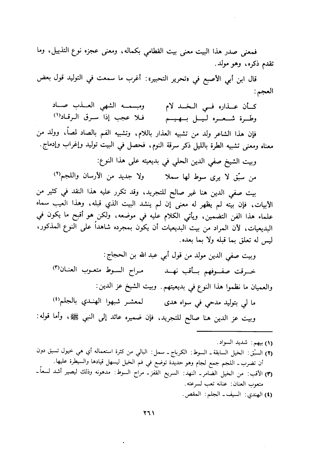 بيت صفي الدين هنا غير صالح للتجريد، وقد تكرر عليه هذا النقد في كثير من الأبيات، فإن بيته لم يظهر له معنى إن لم ينشد البيت الذي قبله، وهذا العيب سماه علماء هذا الفن التضمين، ويأتي الكلام عليه في موضعه، ولكن هو أقبح ما يكون في البديعيات؛ لأن المراد من بيت البديعيات أن يكون بمجرده شاهدًا على النوع المذكور، ليس له تعلق بما قبله ولا بما بعده.